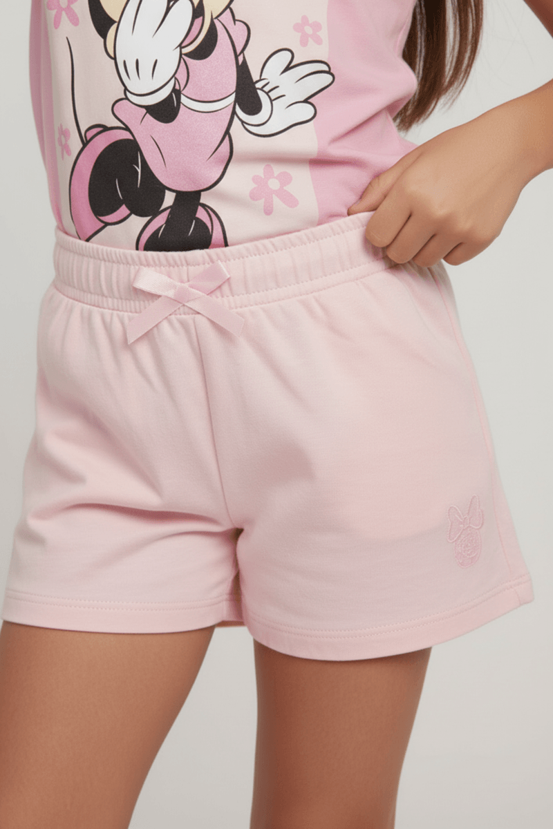 Detalhes do shorts: Cós elástico, laço decorativo, bordado de laço