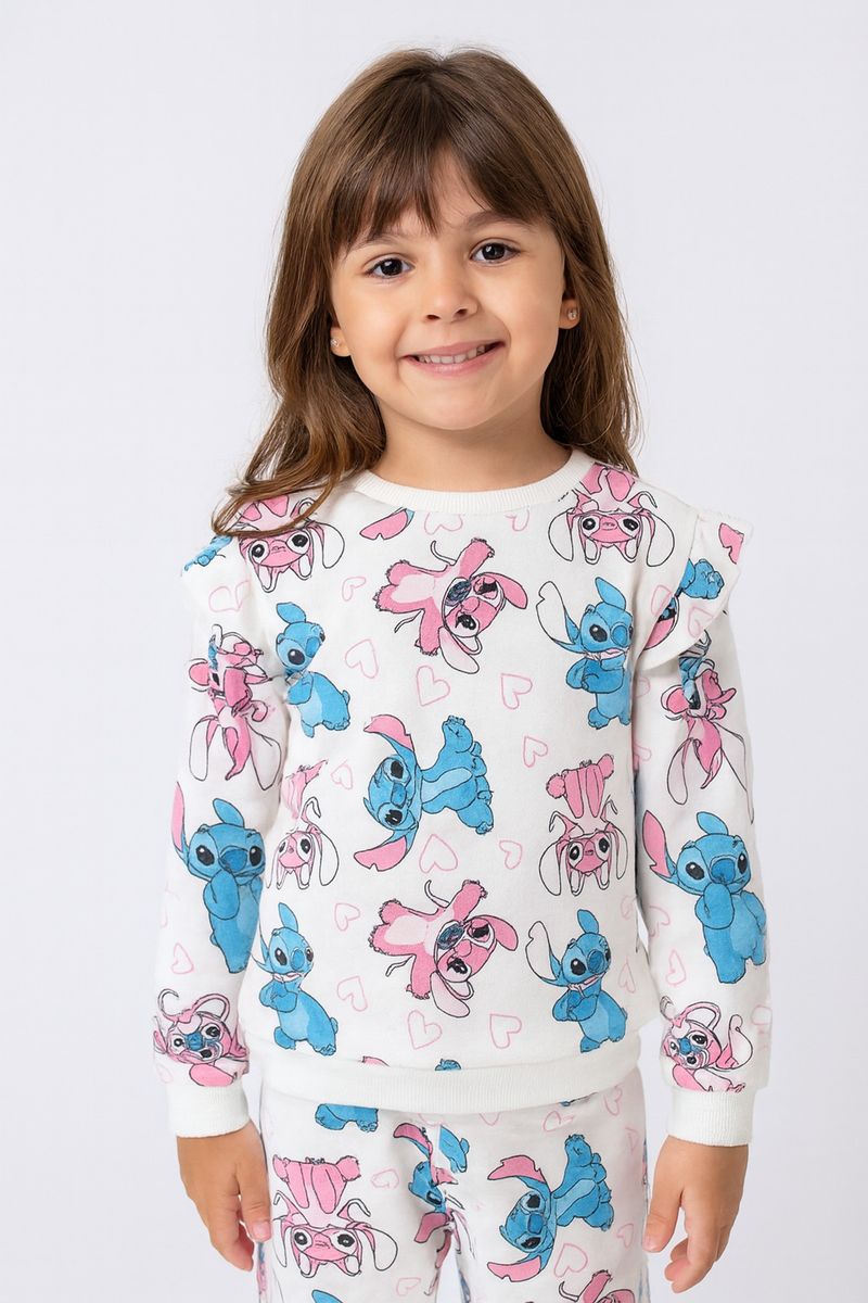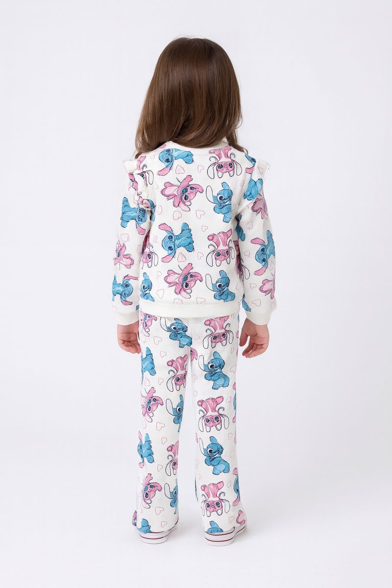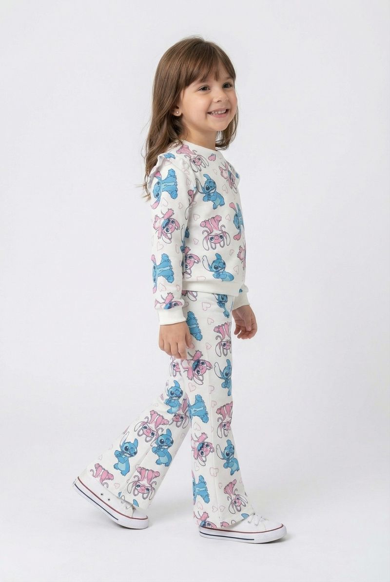 O Conjunto Fofo Infantil Stitch & Angel Caedu é a escolha perfeita! Com blusa de moletom e calça flare off white, este conjunto 100% algodão oferece conforto e estilo. A estampa vibrante de Stitch e Angel garante um visual lúdico e divertido.