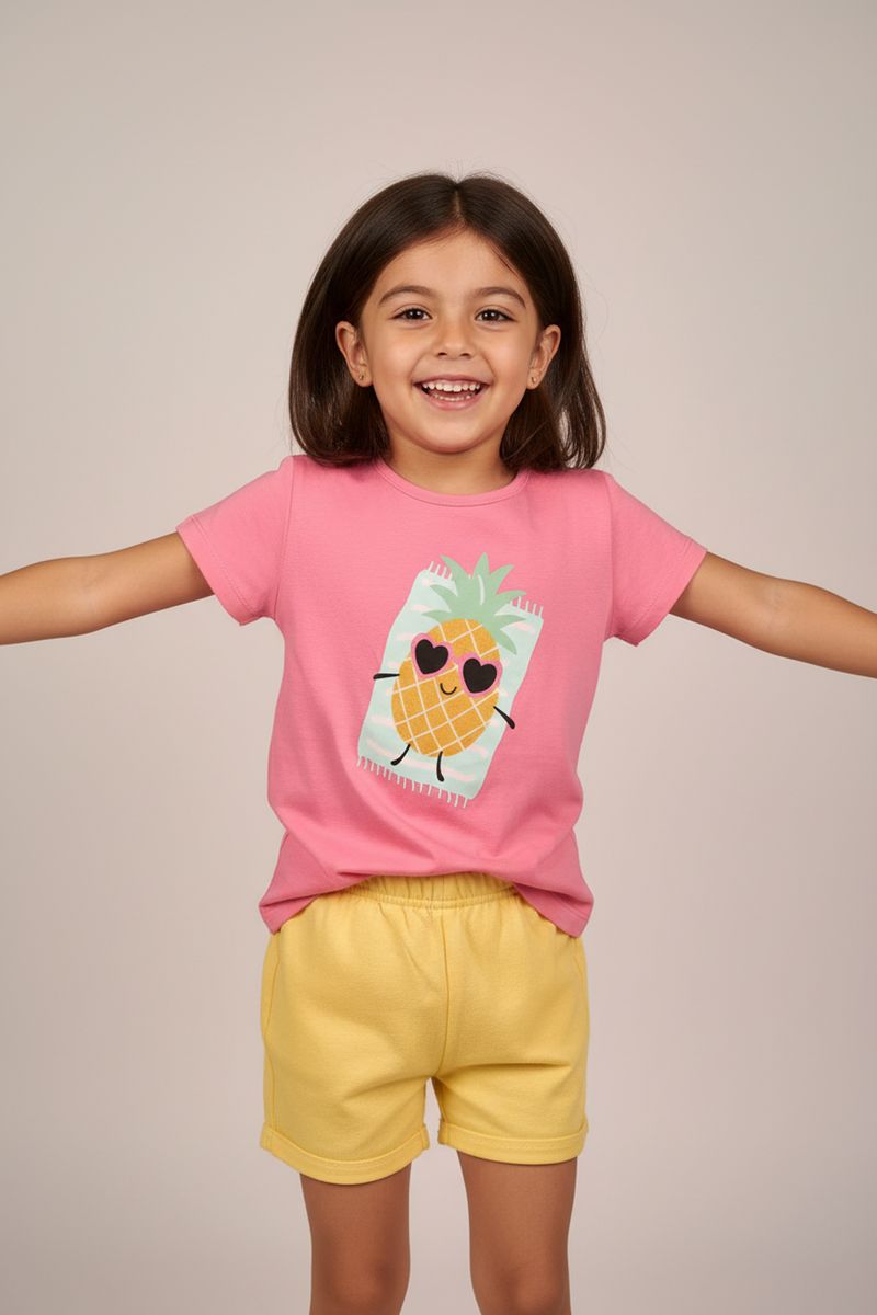 O Conjunto Infantil Abacaxi Relax Rosa e Amarelo é ideal para a diversão. Com blusa rosa estampada e shorts amarelo em meia malha, oferece conforto e estilo. Um visual alegre e cheio de vida para a moda infantil.