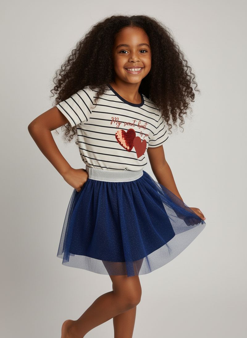 O Conjunto Menina Caedu My Sweetheart oferece um visual encantador e moderno. Com blusa listrada off-white e estampa "My sweet heart" com corações brilhantes, e uma saia de tule azul-marinho com glitter e cintura prateada, é perfeito para sua pequena brilhar com muito estilo e conforto.