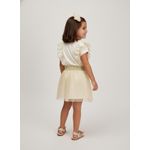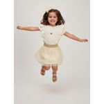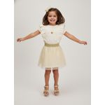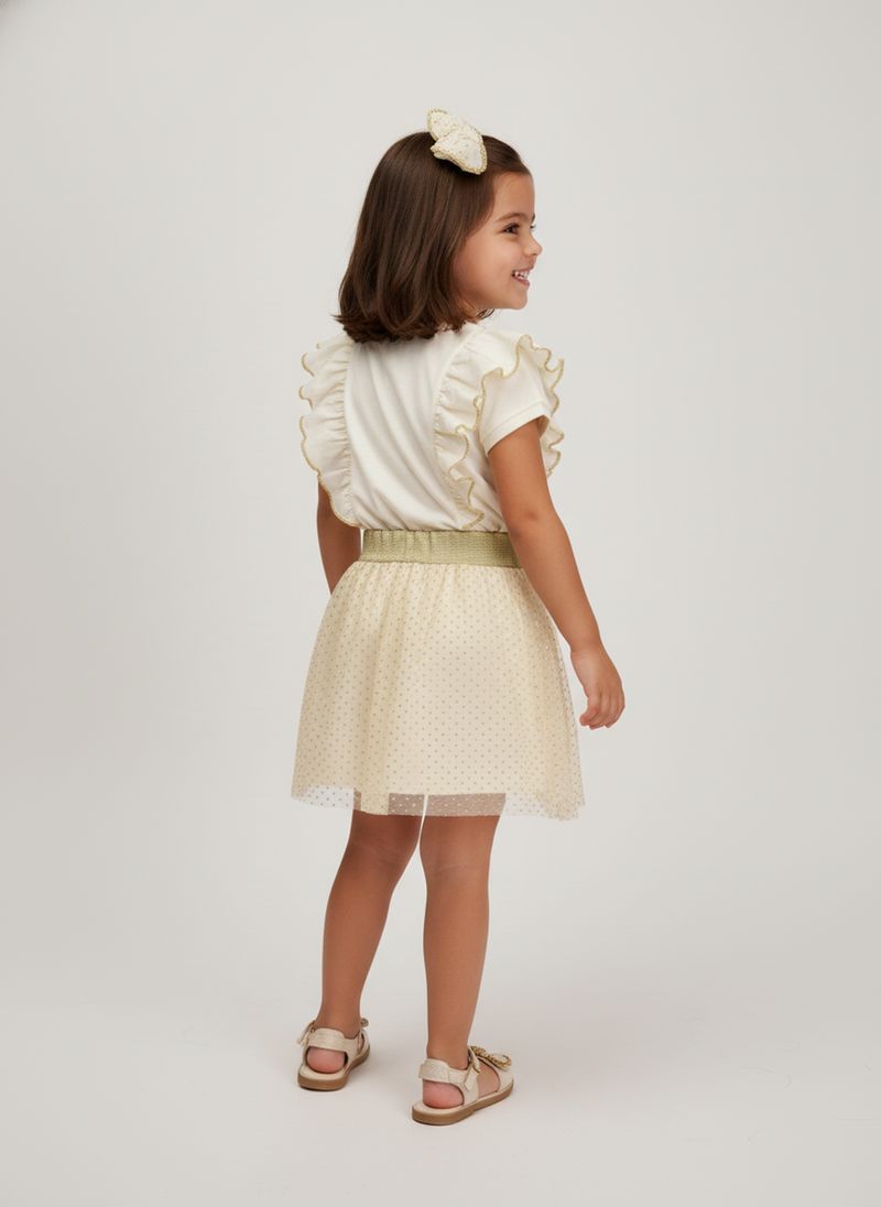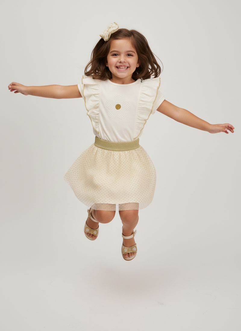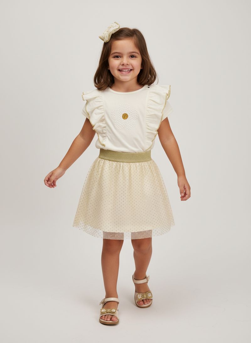 Desperte o brilho da sua pequena com o Conjunto Infantil Floral Caedu! A blusa off-white com babados dourados e estampa floral, combinada à saia de tule poá dourado, cria um look encantador e festivo. Ideal para momentos especiais, este conjunto de roupa infantil oferece estilo e conforto para sua menina brilhar.