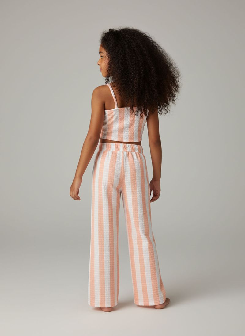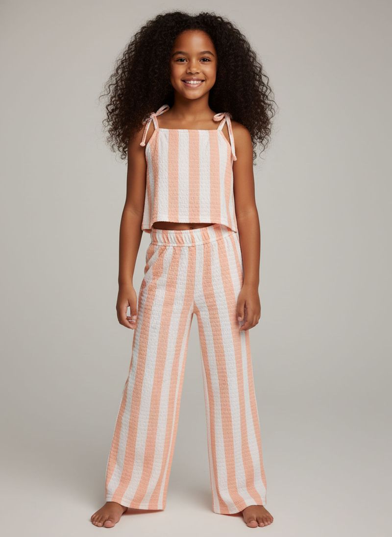 O Conjunto Infantil Caedu listrado coral e branco oferece estilo e conforto para as pequenas. Com cropped de alças finas e calça pantalona de corte reto, este conjunto de roupa infantil é perfeito para um visual moderno e divertido.