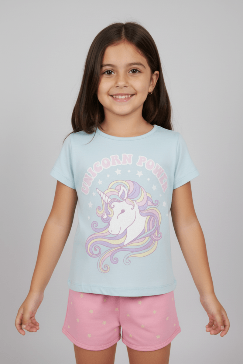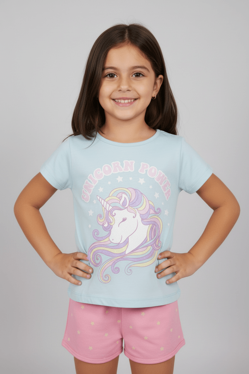 Realce a magia da sua menina com o Conjunto Infantil Caedu Unicórnio Power Azul. Confeccionado em meia malha, oferece conforto e liberdade para brincar. Com blusa azul e shorts rosa de estrelas, é a escolha perfeita para um visual encantador e cheio de estilo, uma roupa infantil essencial para o dia a dia.