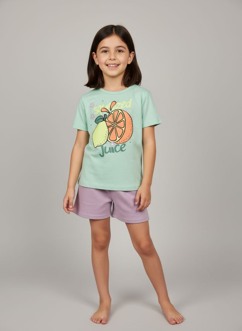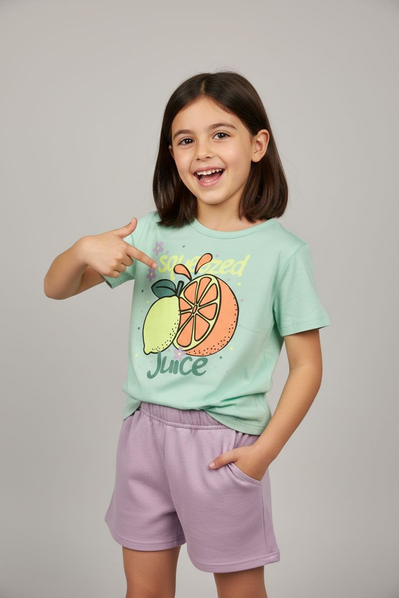 Desperte a alegria com o Conjunto Infantil Verão Squeezed Juice Infantil! Com uma blusa verde clara de estampa vibrante de frutas cítricas e um shorts lilás pastel, este conjunto em meia malha oferece o máximo de conforto e estilo para as pequenas. Perfeito para brincadeiras e momentos de lazer, é a roupa infantil ideal para um visual charmoso e cheio de vida.