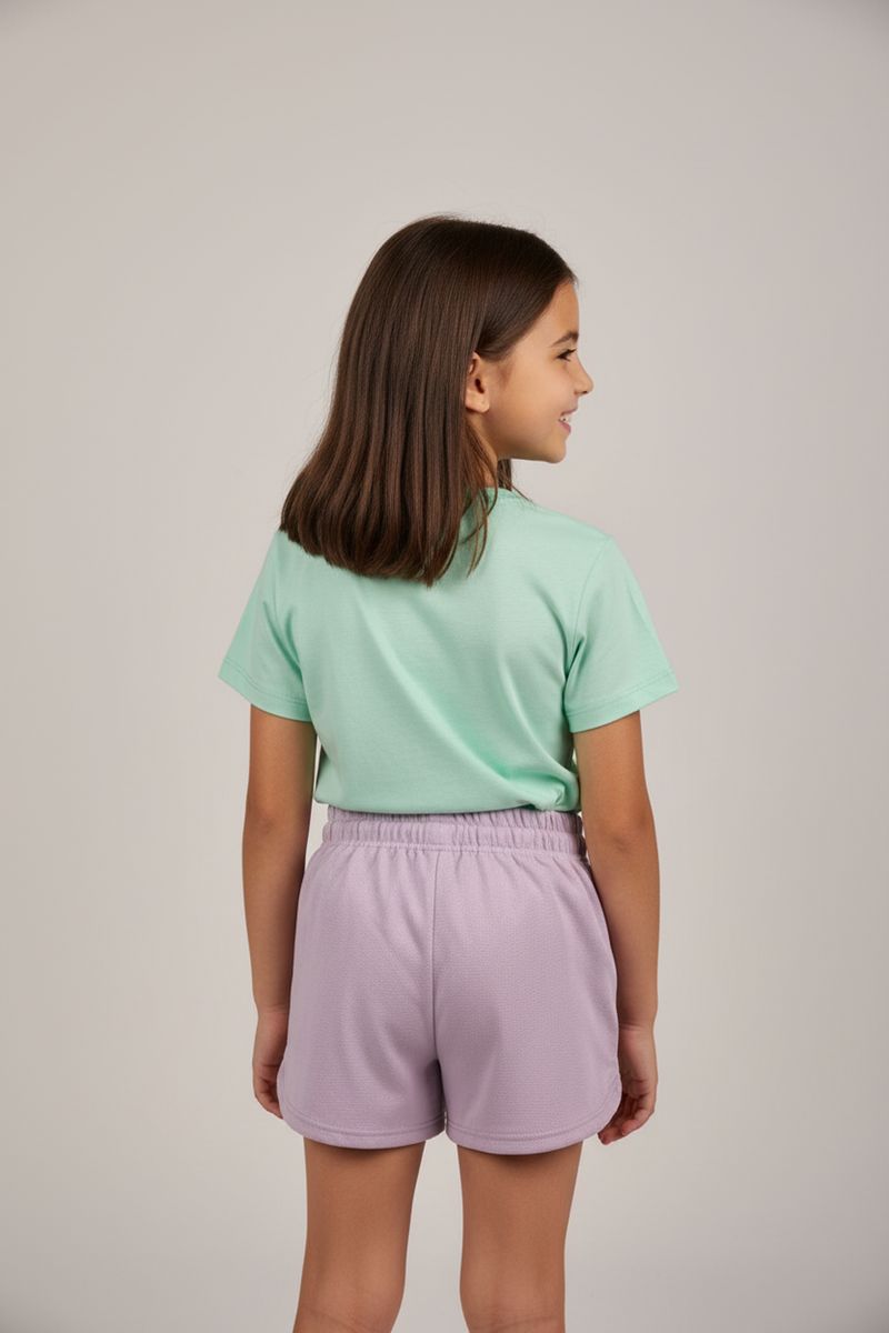 Combine a blusa verde com estampa de frutas e o shorts lilás com tênis brancos ou coloridos para um visual despojado. Para um toque extra de estilo, adicione uma jaqueta jeans leve em dias mais frescos ou sandálias confortáveis para passeios. Um boné ou chapéu complementa o look, protegendo do sol com charme.