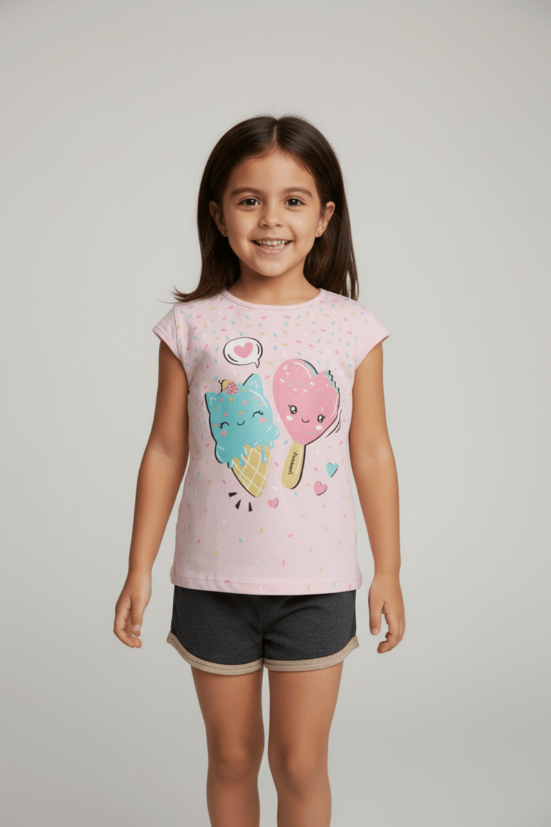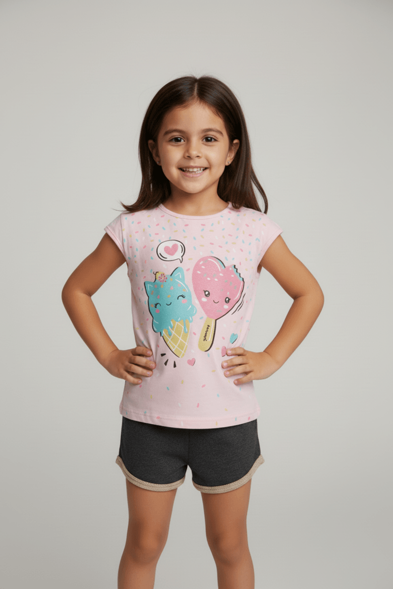 Inspire a alegria da sua pequena com o Conjunto Infantil Caedu! A blusa em meia malha rosa com estampa de sorvetes fofos e o shorts de malha cinza garantem conforto e estilo. Uma roupa infantil perfeita para brincar e se divertir com a moda Caedu.