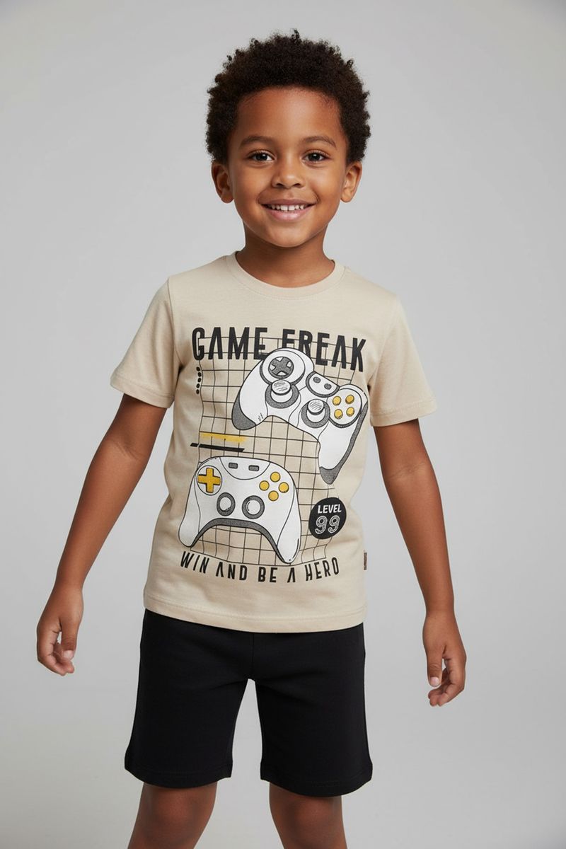 Prepare seu pequeno para a diversão com o Conjunto Infantil Gamer 'Game Freak' Caedu! Confeccionado em 100% algodão de meia malha, oferece conforto e liberdade para brincar. Com estampa de videogame inspiradora, este conjunto bege e preto é a roupa perfeita para os futuros heróis dos games. Garanta já este estilo único e vibrante!