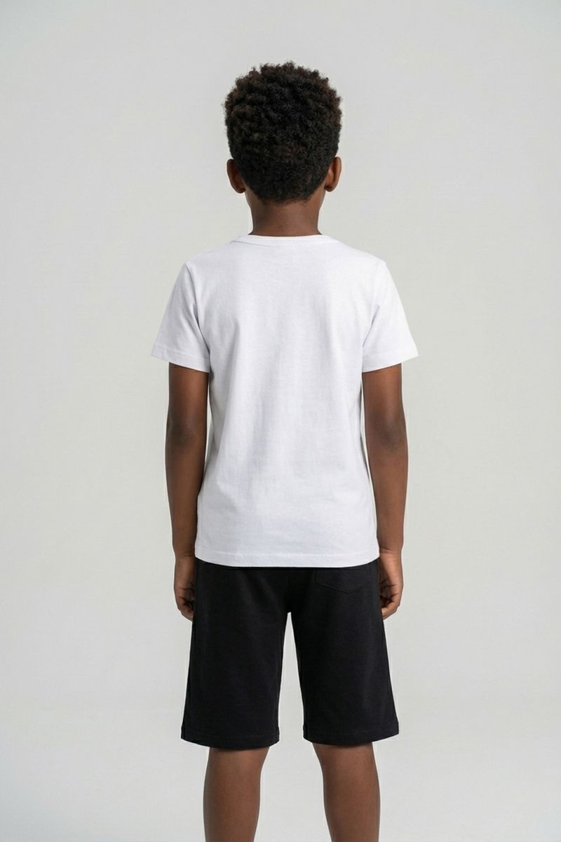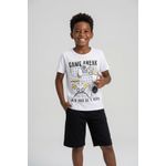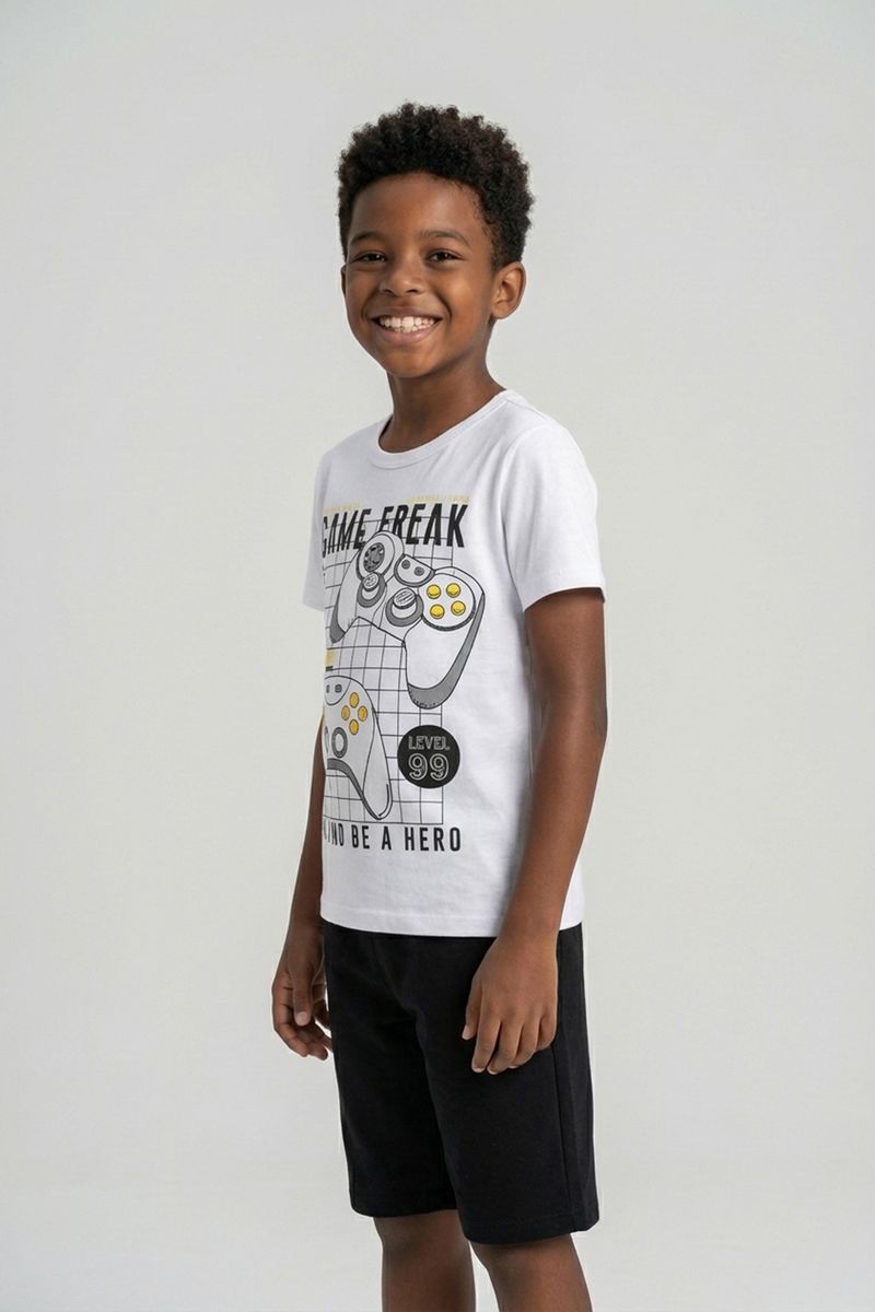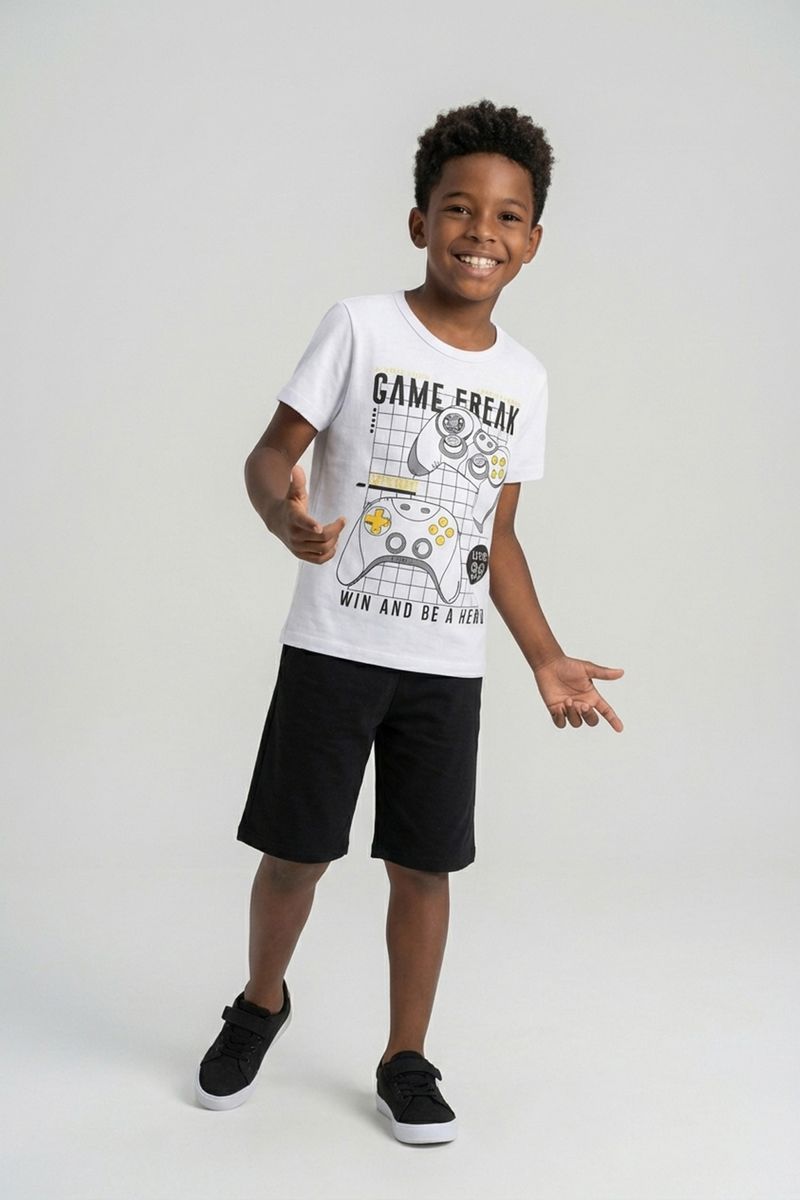 O Conjunto Infantil Game Freak Caedu oferece conforto e estilo para os pequenos aventureiros. Com blusa branca estampada com tema de videogame e shorts preto, é a roupa infantil perfeita para brincar e se divertir com muito estilo gamer.