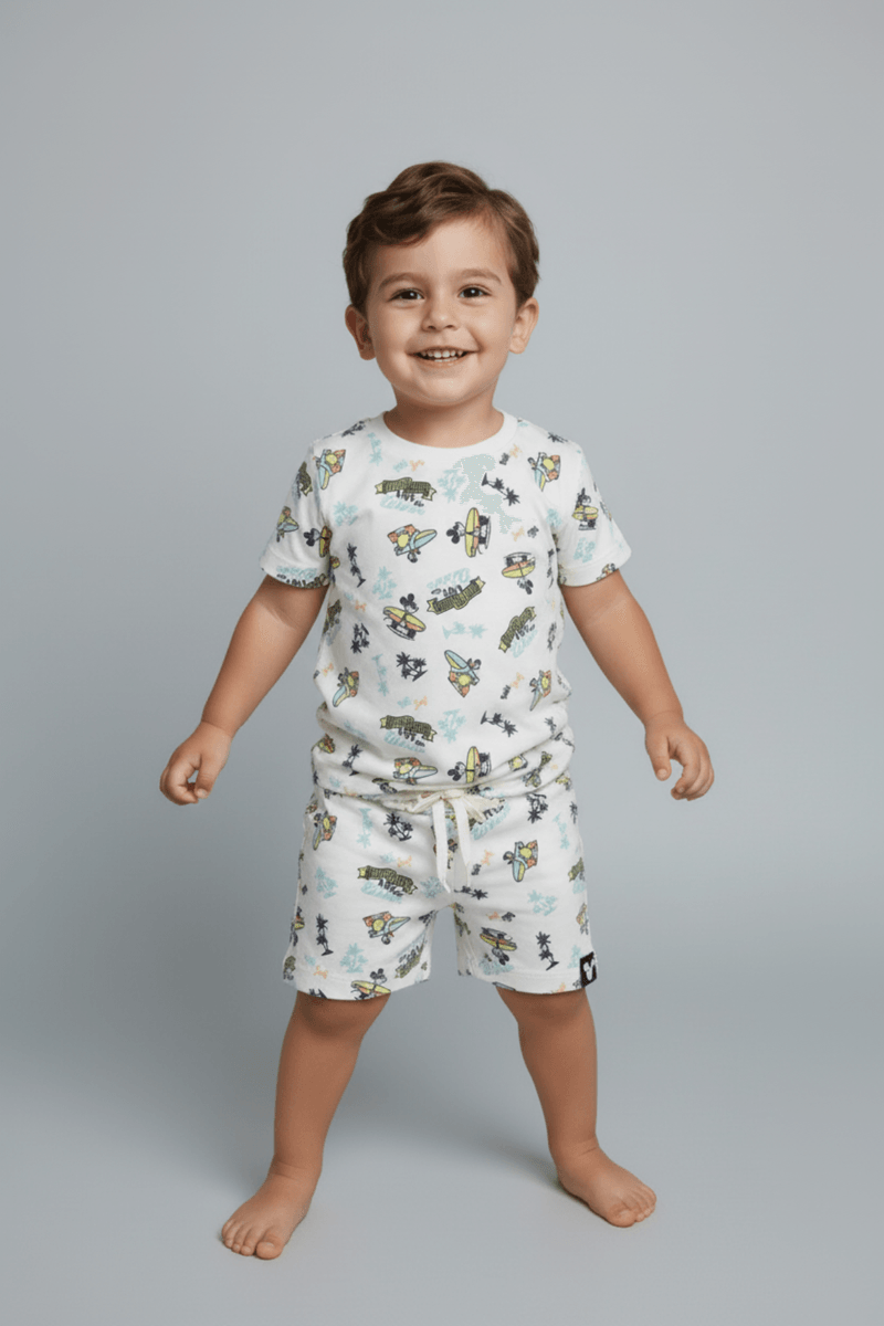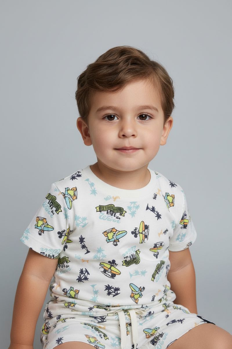 Prepare seu pequeno para a aventura com o Conjunto Infantil Caedu Favinho Mickey Surf. Com blusa e shorts em tecido favinho off-white, este conjunto oferece conforto e estilo para brincadeiras. A estampa vibrante do Mickey surfista traz a alegria da praia para o dia a dia, ideal para a moda infantil.