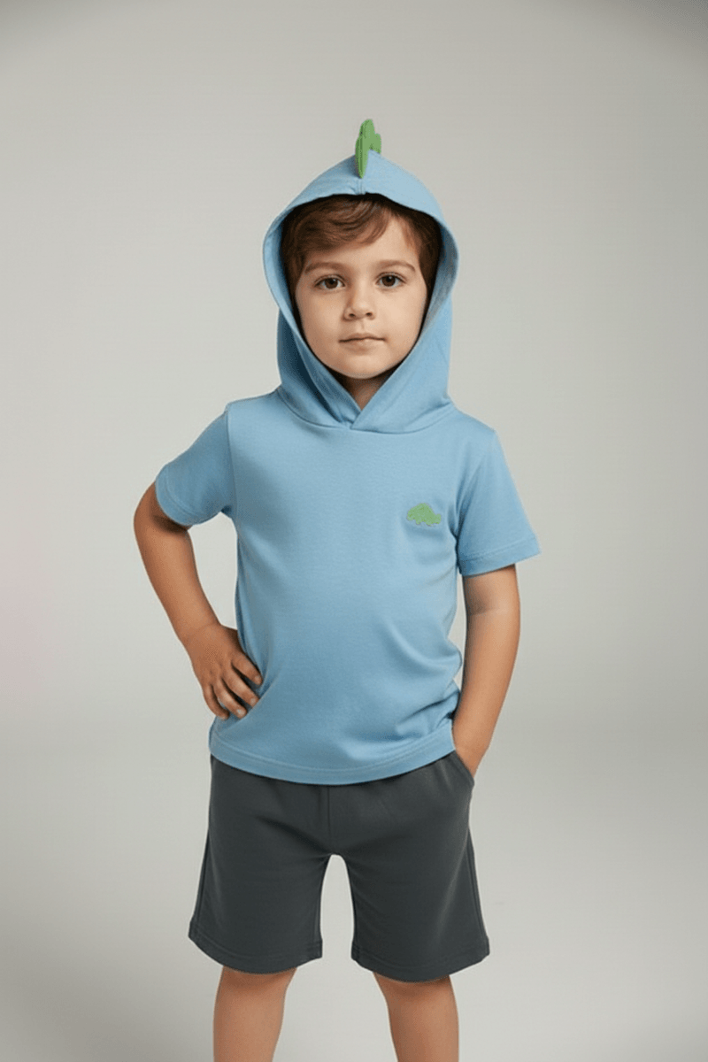 Conjunto Infantil Caedu Dino Aventura: Blusa com Capuz Azul Claro e Shorts Cinza