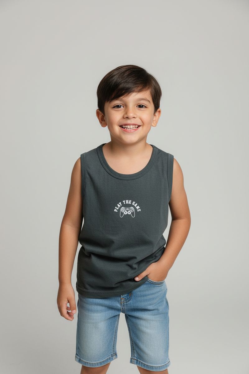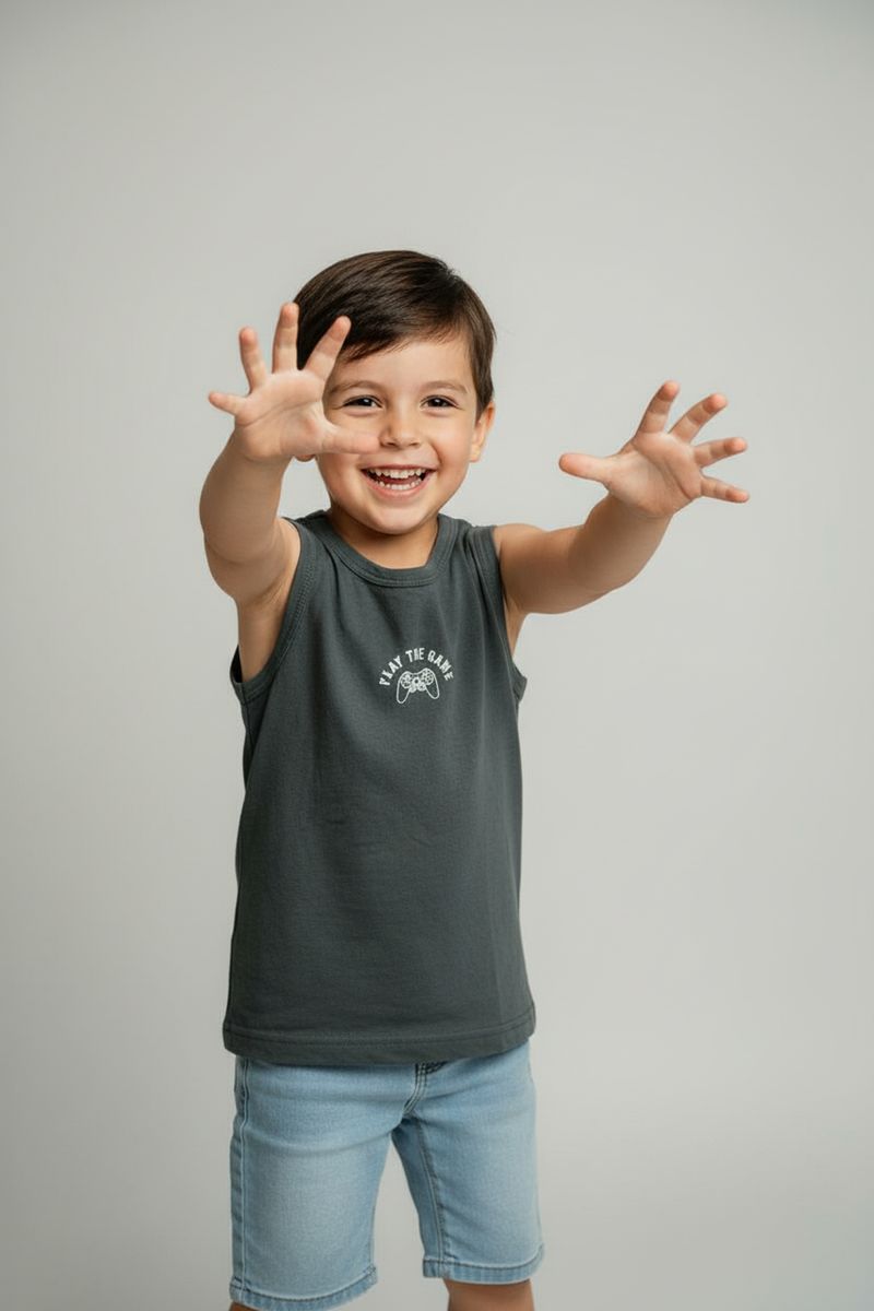Descubra o Conjunto Infantil Caedu, a roupa ideal para seu pequeno gamer! Com regata 100% algodão e estampa "Play the Game", e bermuda jeans moderna, garante conforto e estilo. Perfeito para a moda infantil conforto e diversão!