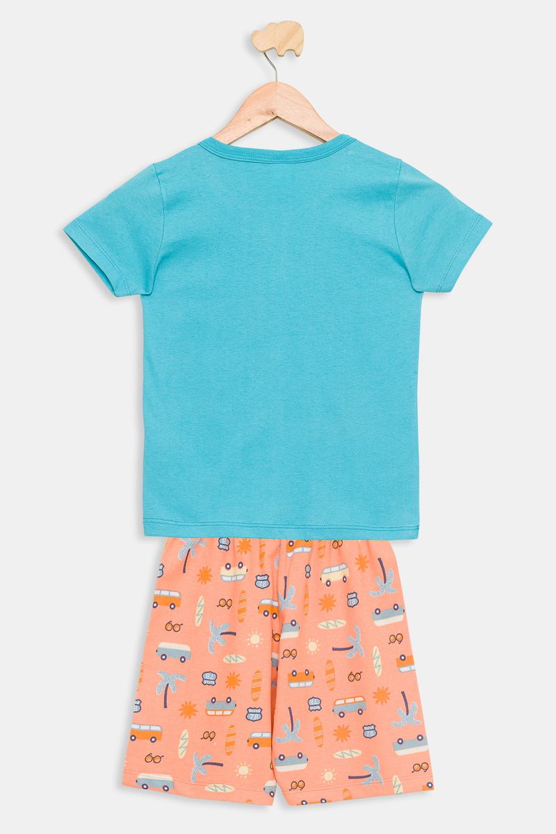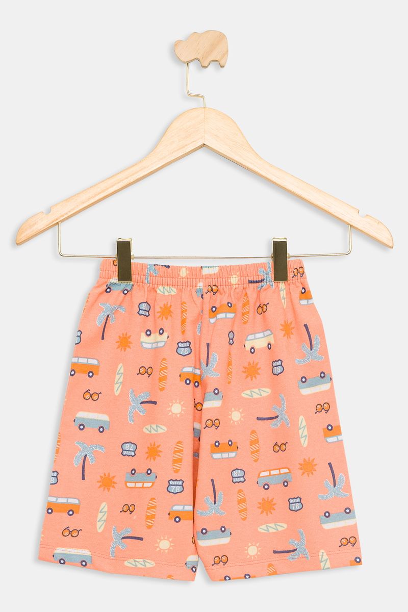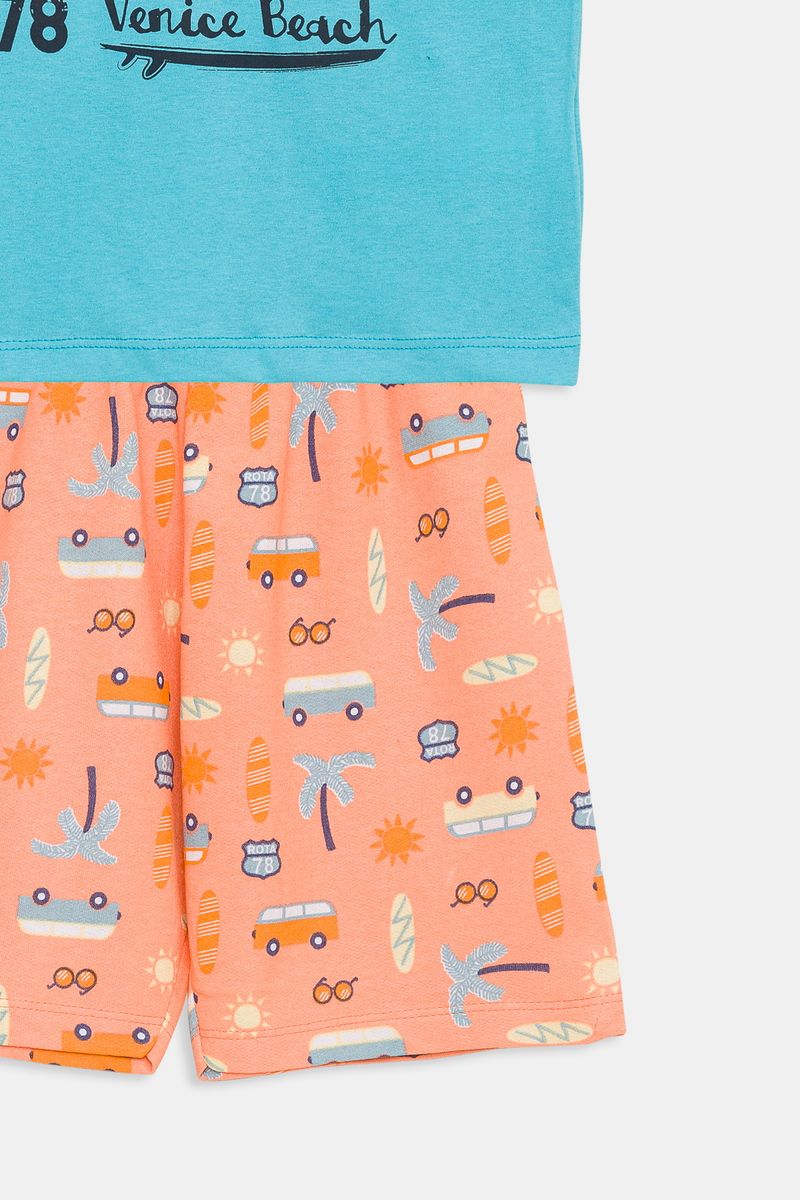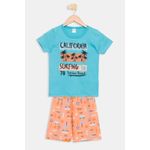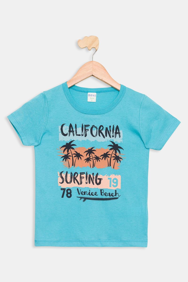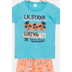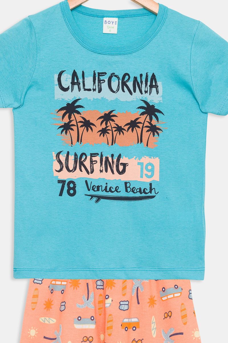 Conjunto infantil com camiseta com tema de California e shorts estampado. Ideal para os dias de calor, trazendo frescor e estilo para os pequenos.