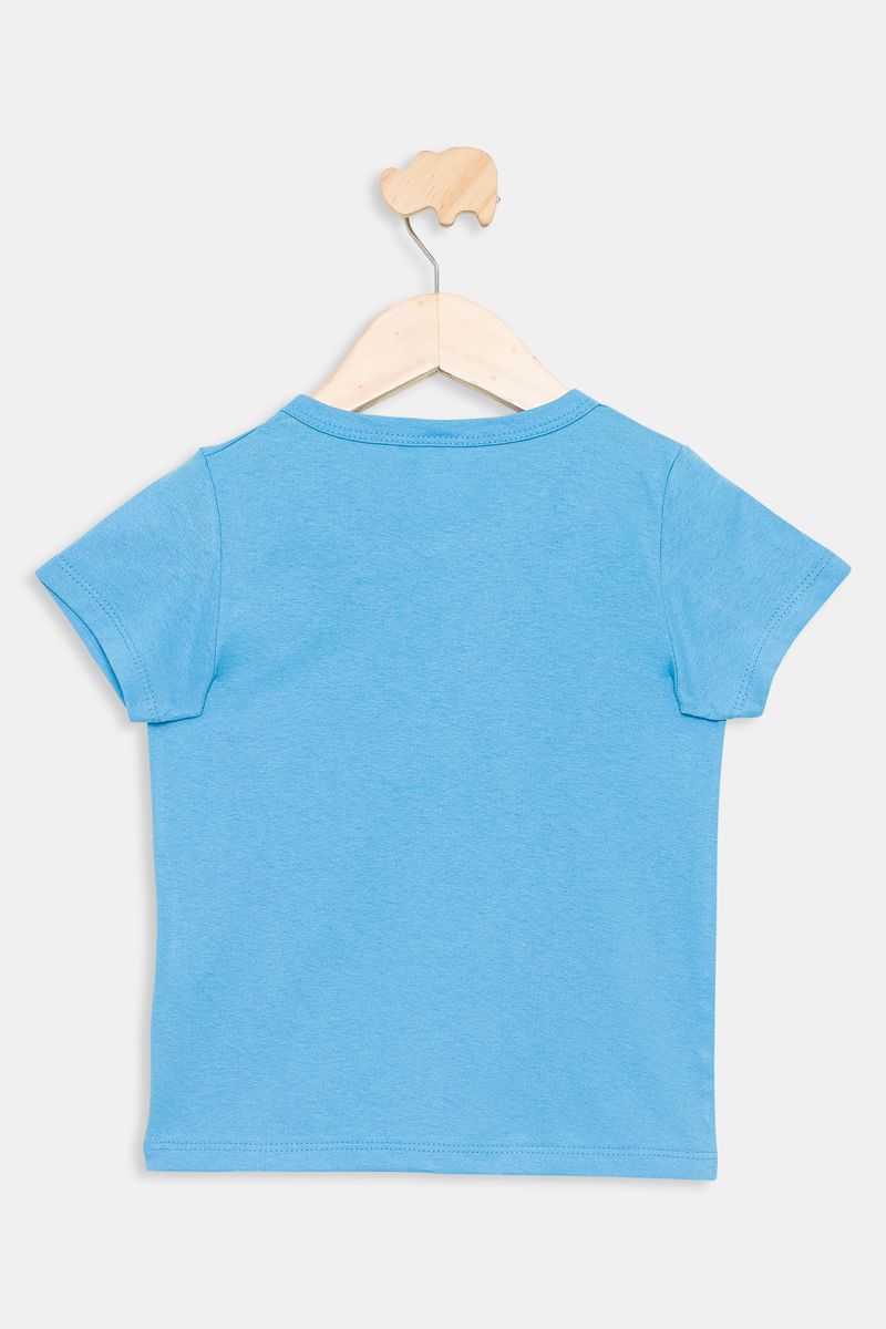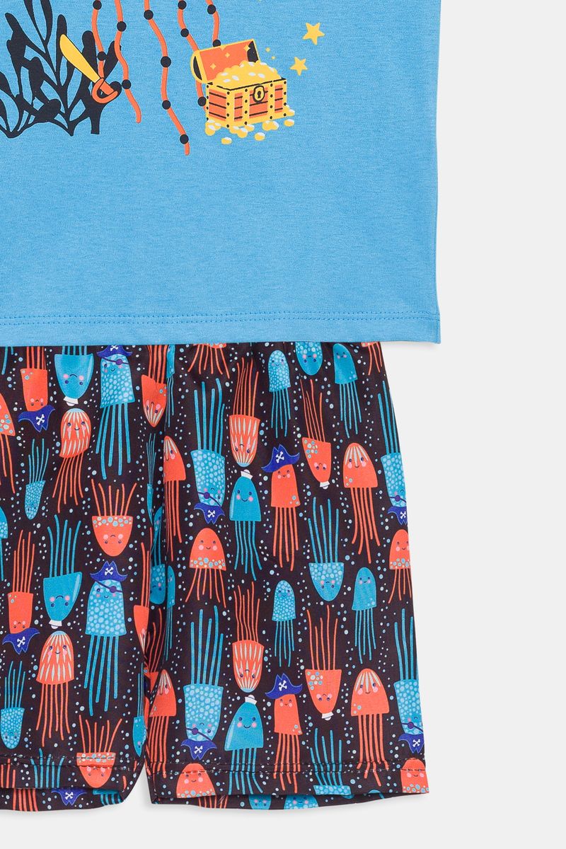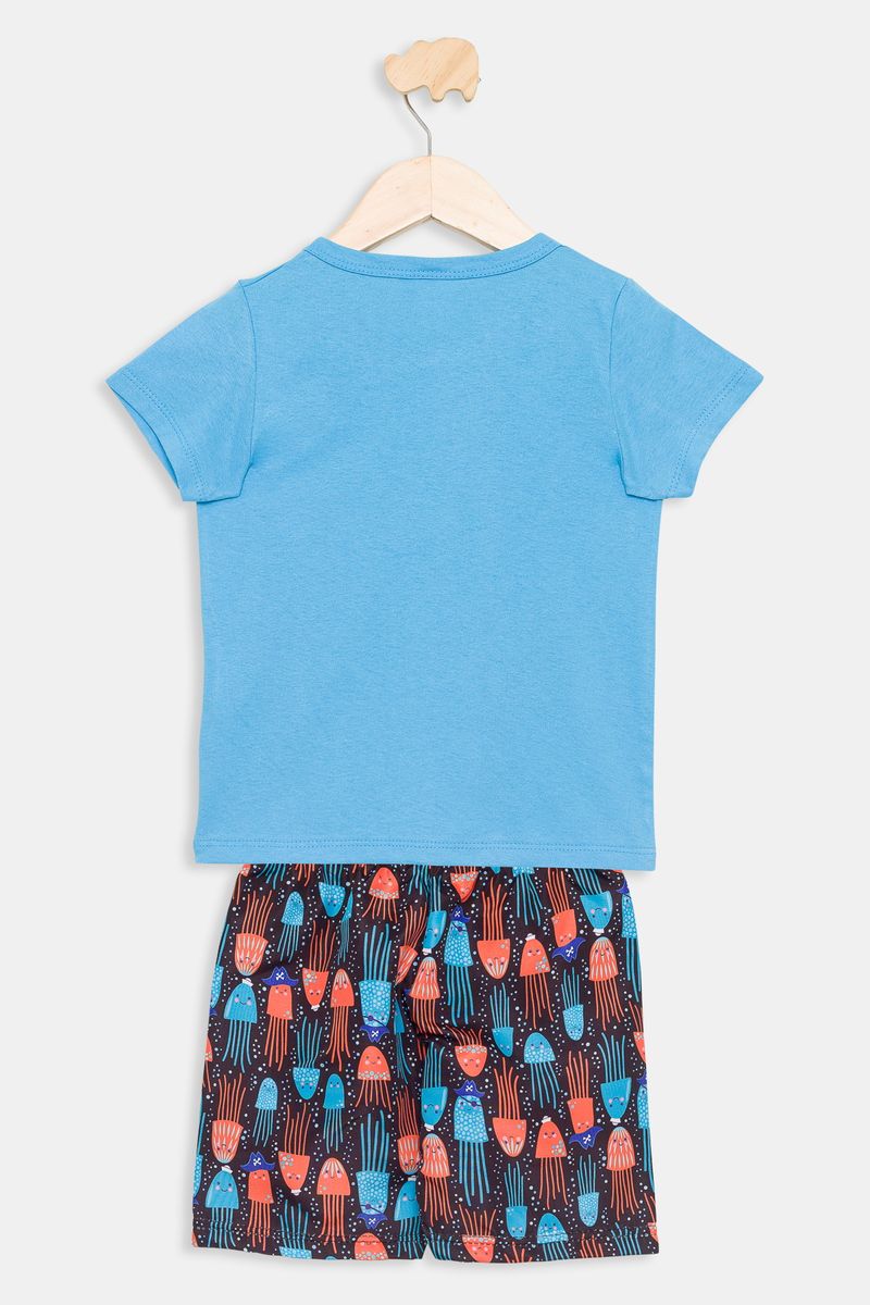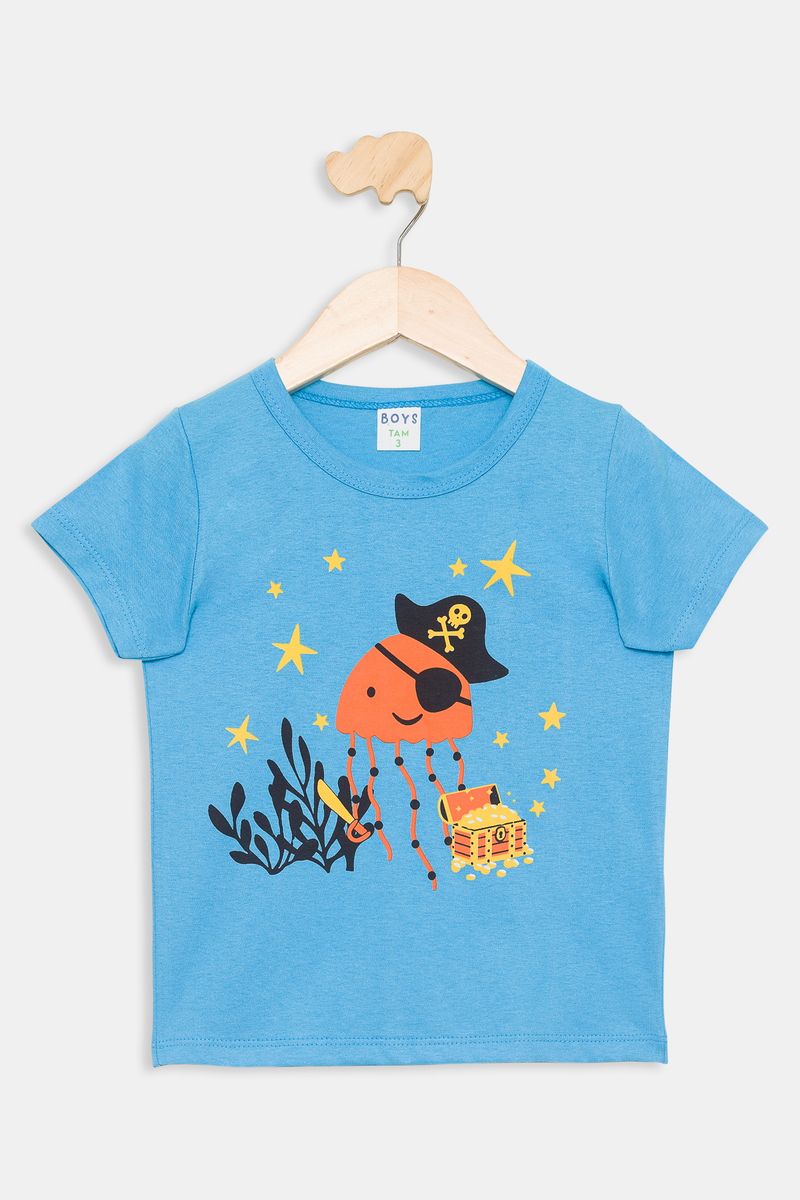 Conjunto infantil com camiseta e shorts de pirata, azul, para os pequenos aventureiros.