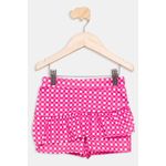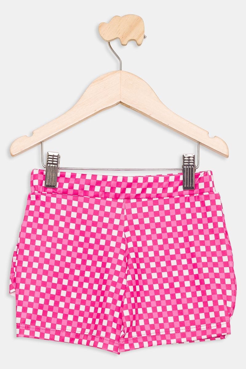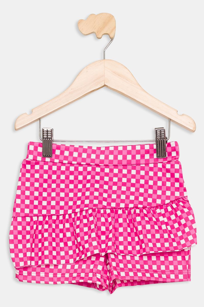 Detalhes do short: Estampa xadrez rosa choque e branco com babado frontal