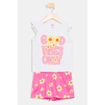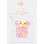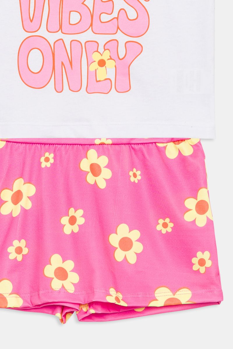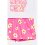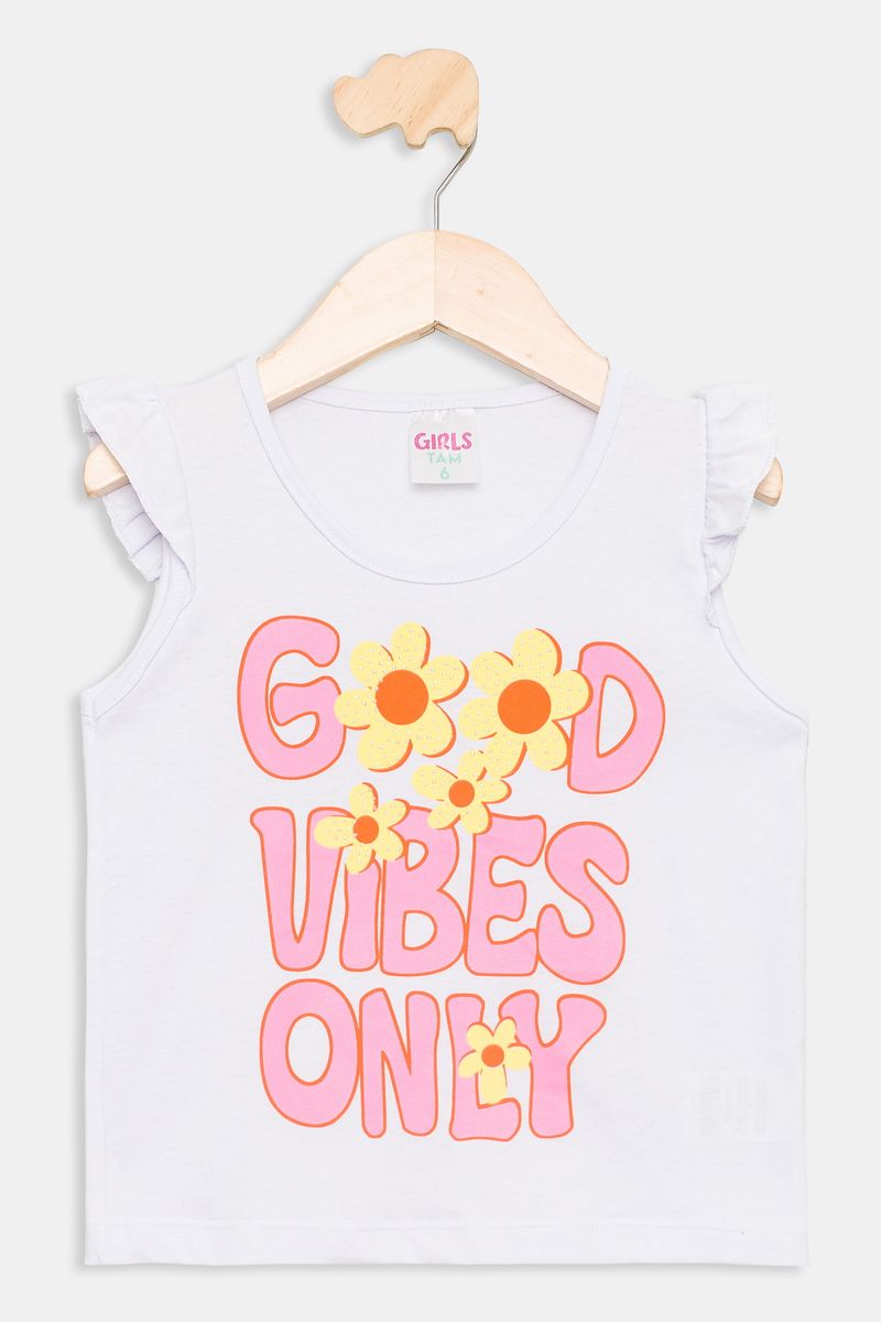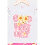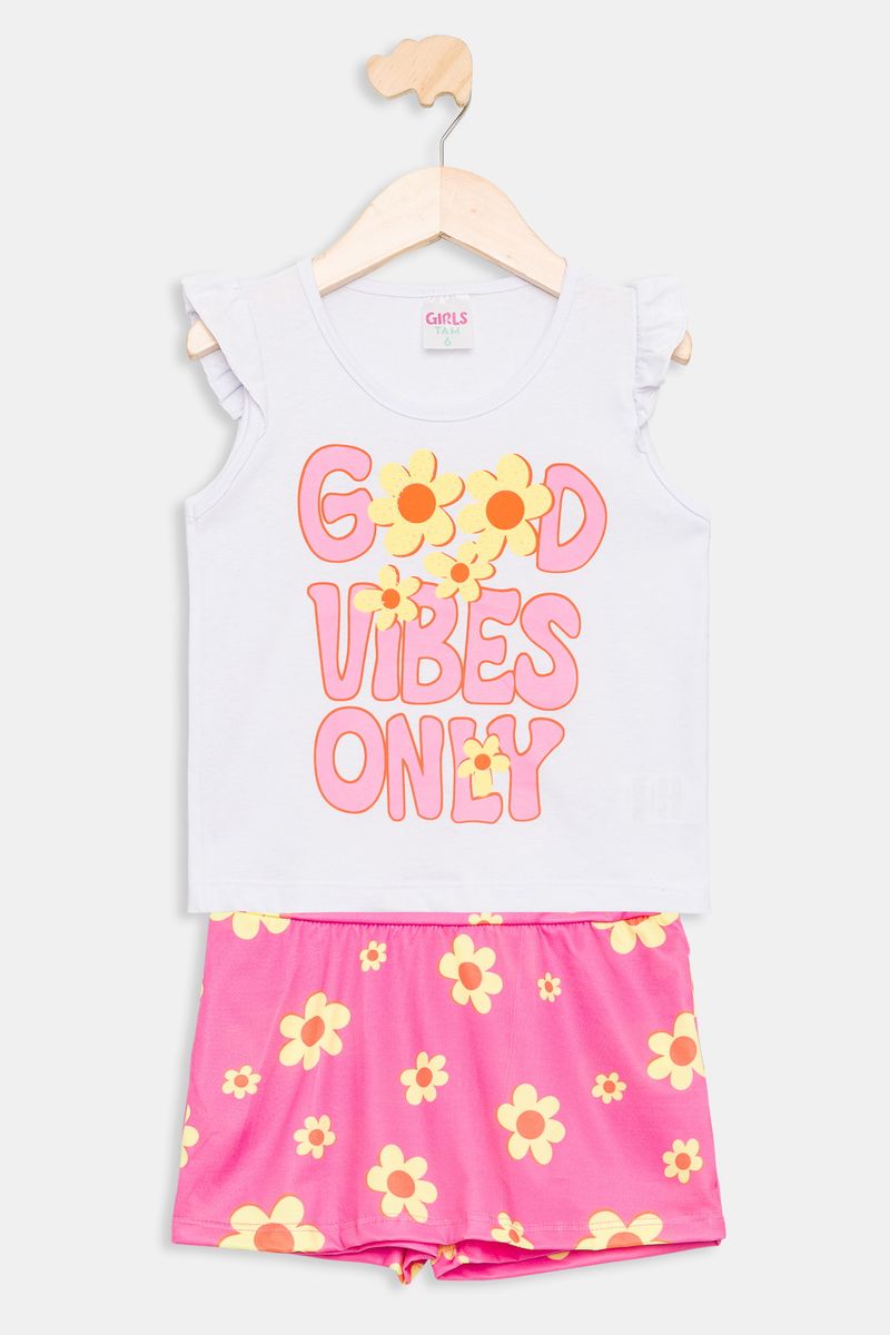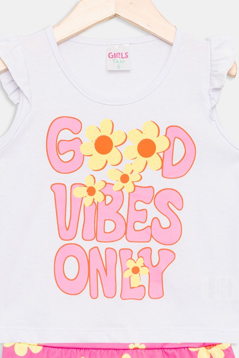 Desperte a alegria com o Conjunto Infantil Meninas Good Vibes Floral Caedu! Um look delicado e cheio de estilo, perfeito para as pequenas. A blusa branca com babados e estampa 'GOOD VIBES ONLY' combina com o short rosa vibrante floral, garantindo conforto e charme em cada momento. Uma roupa infantil que inspira!