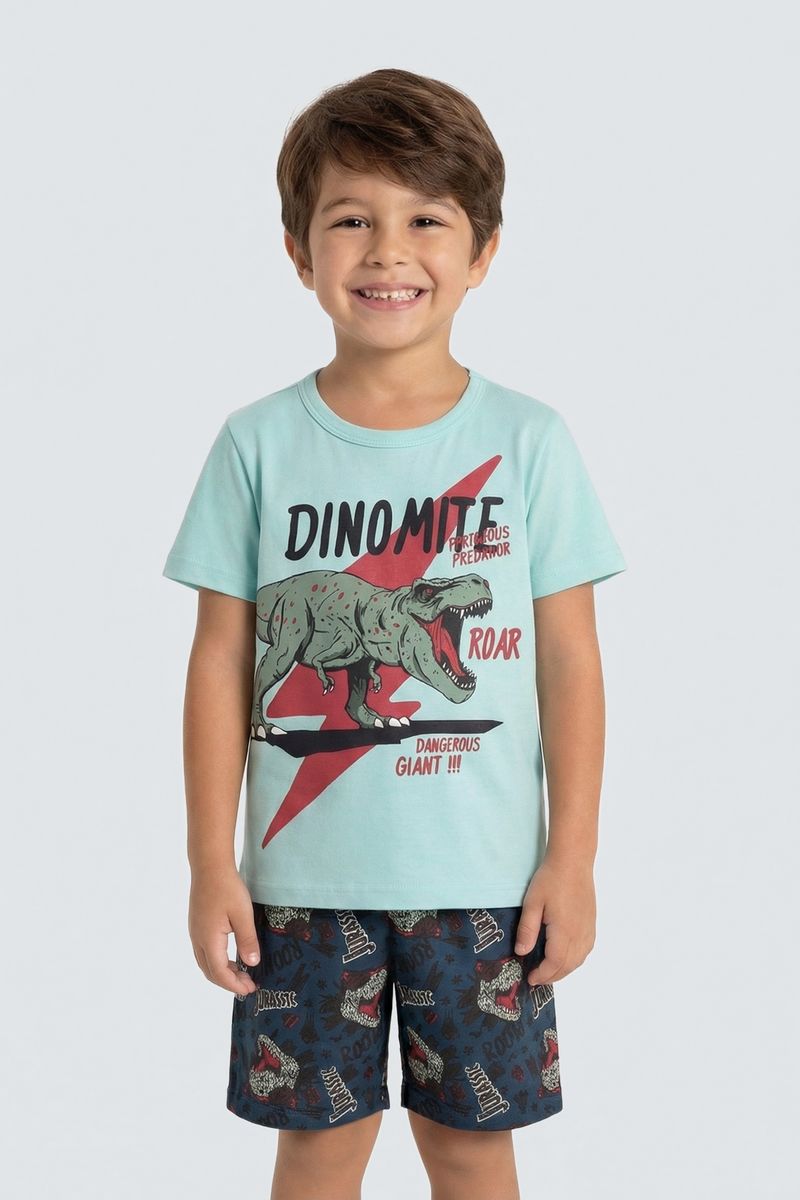 O Conjunto Infantil Dinomite T-Rex Caedu, com blusa 100% algodão em Verde Água (tom Pistache) e shorts estampado Jurassic, oferece conforto e moda. Ideal para pequenos aventureiros, este conjunto é pura diversão e estilo.