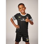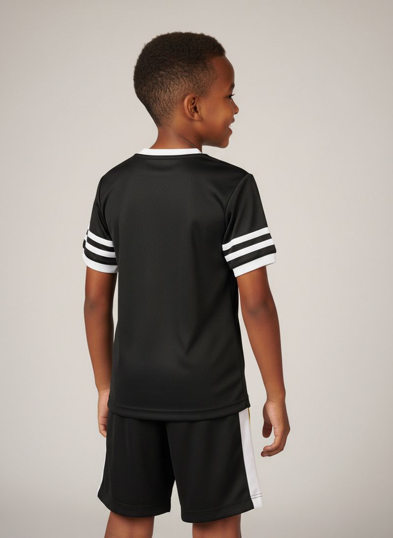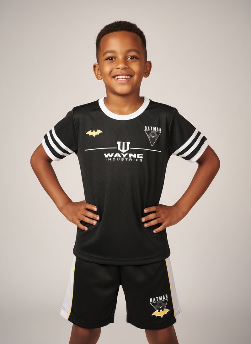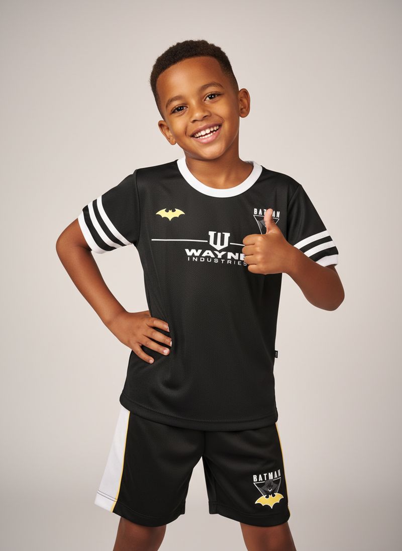 Combine o Conjunto Jersey Batman Preto com um tênis esportivo para um visual despojado e pronto para a ação. Para dias mais frescos, adicione uma jaqueta jeans ou um moletom liso por cima. Um boné preto ou amarelo pode complementar o look, trazendo ainda mais estilo e personalidade ao pequeno herói.
