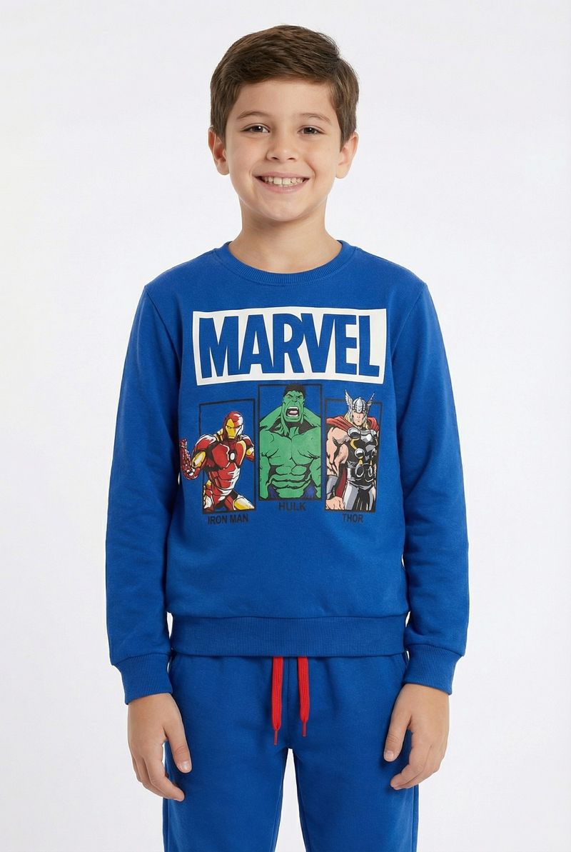 Detalhes do moletom: Gola redonda, punhos e barra canelados, estampa Marvel Vingadores