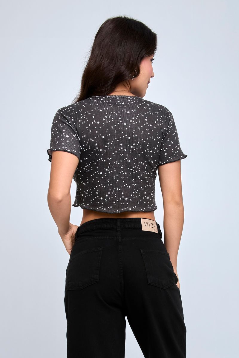 Cropped feminino preto com estampa de estrelas. Um visual moderno para quem gosta de ousar com conforto.