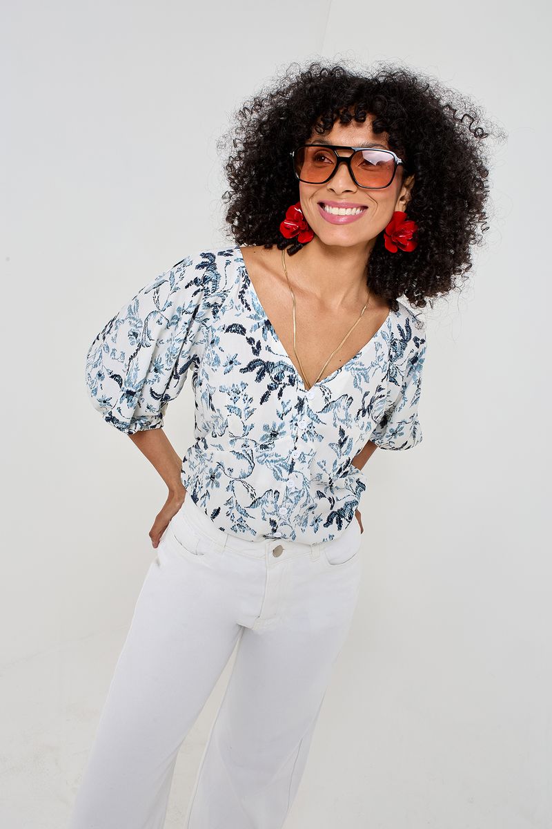 Combine esta blusa vibrante com uma calça branca para um visual fresco e sofisticado, ou com um jeans para um estilo mais casual. Adicione sandálias de salto ou tênis brancos para completar o look. Acessórios dourados e óculos de sol realçam a beleza da estampa floral, criando um visual inspirador da Caedu loja virtual.