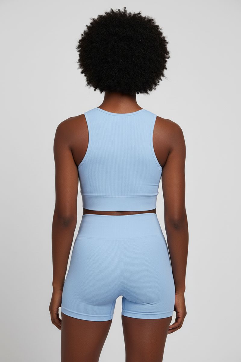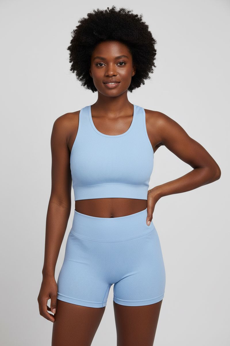 Combine seu Top Ginástica Seamless Canelado Azul Claro com leggings de cintura alta para um treino completo, ou shorts esportivos para dias mais quentes. Adicione um tênis moderno e uma jaqueta leve para um visual despojado e funcional, perfeito para a moda fitness e casual. Experimente também com calças de moletom para um look mais relaxado. Crie looks inspiradores com esta roupa versátil.