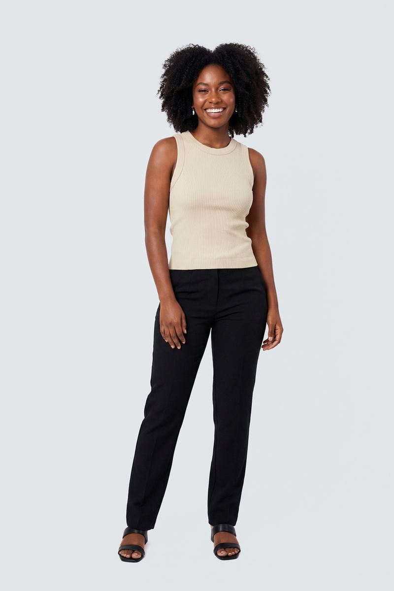 Combine sua regata off-white com uma calça de alfaiataria preta para um look elegante de trabalho, ou com jeans e tênis para um visual mais casual. Adicione um blazer para sofisticação ou uma jaqueta jeans para um toque despojado. Sandálias de salto baixo ou sapatilhas completam o look com versatilidade.