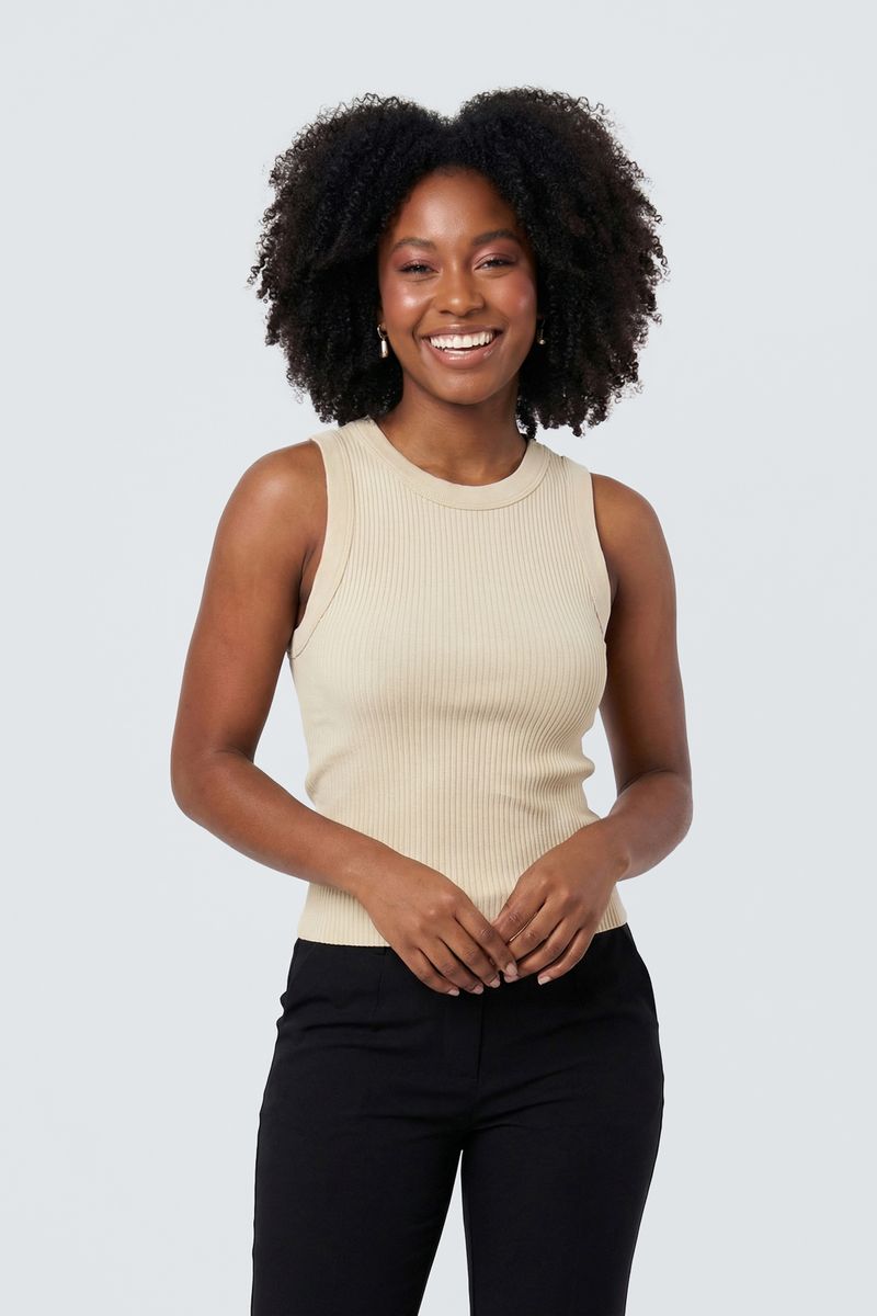 A Regata Canelada Gola Alta Off-White Essencial Caedu é a peça-chave para um look elegante. Em malha canelada (poliamida e elastano), oferece conforto e caimento ajustado. Essencial para a moda feminina.