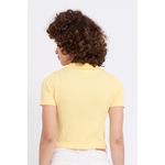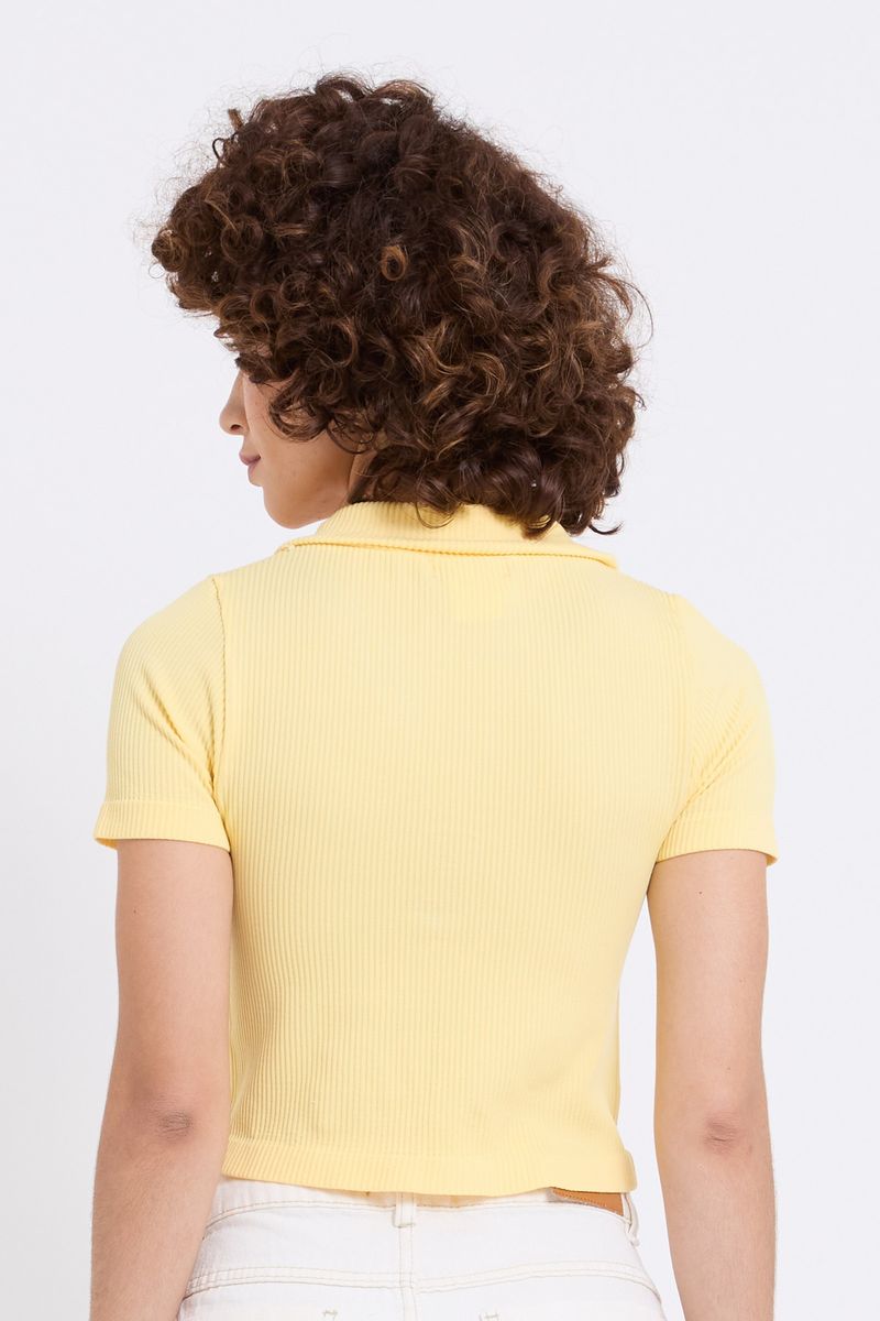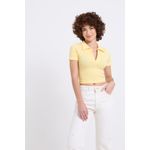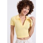 Realce seu estilo com o Top Cropped Polo Canelado Amarelo Suave Caedu. Em ribana com elastano, oferece conforto e caimento justo, valorizando a silhueta. Com gola polo e textura canelada, é a roupa ideal para um visual moderno e cheio de moda.