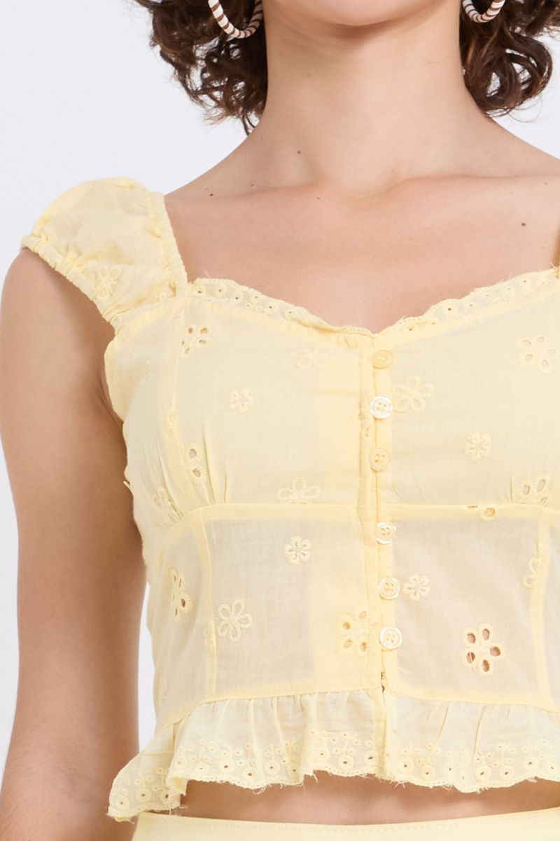 Sinta-se deslumbrante com o Top Laise Amarelo Claro Romântico da Caedu. Confeccionado em laise 100% algodão, este top oferece conforto e um toque de sofisticação. Seu design com manga bufante e detalhe em peplum adiciona um charme único, perfeito para quem busca moda romântica e estilo. Ideal para compor looks modernos e delicados.