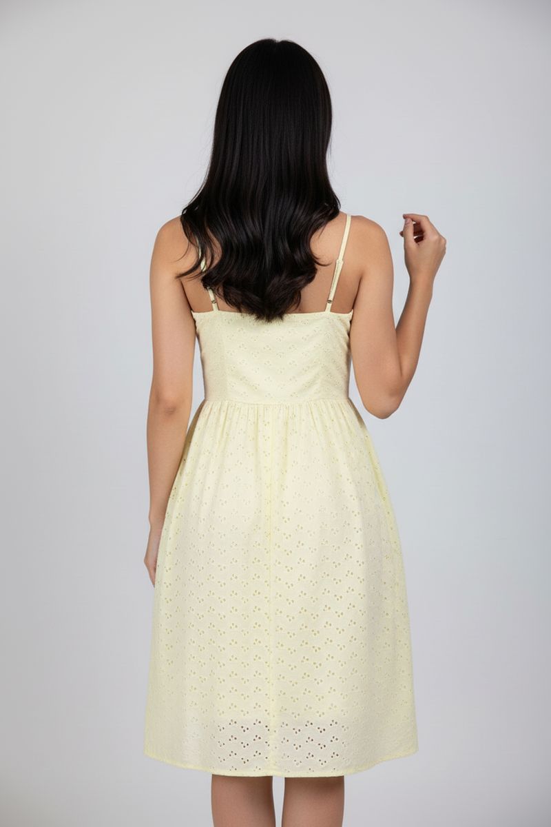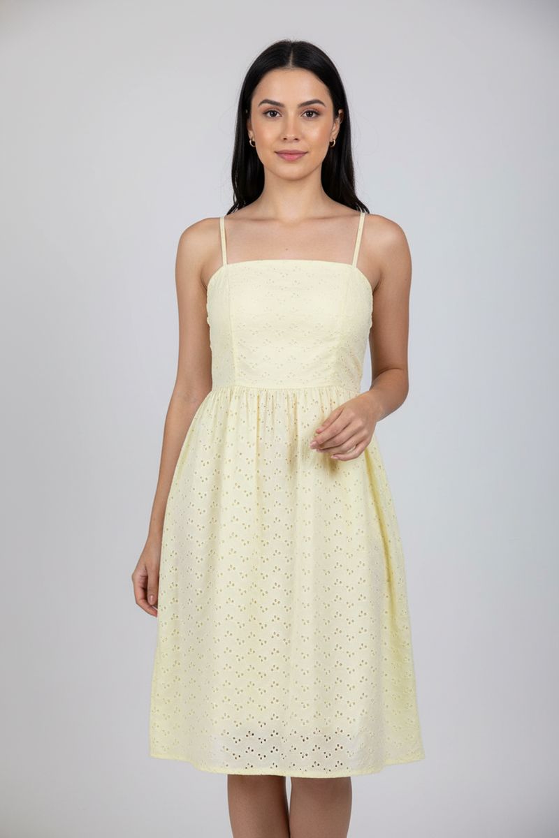 Sinta a leveza e o charme do Vestido Midi Laise Amarelo Claro da Caedu. Com alças finas e decote reto, seu tecido laise proporciona um caimento fluído e confortável. Ideal para um visual elegante e cheio de estilo, realçando sua moda.