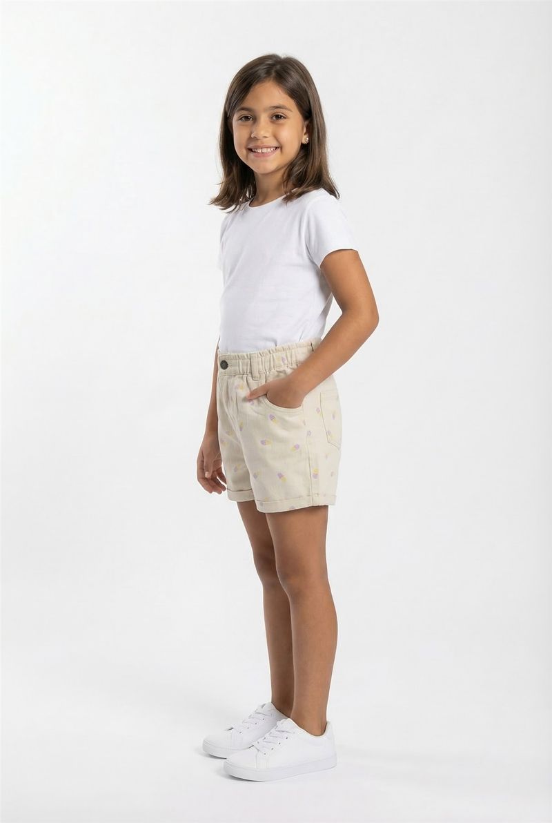 Detalhes: Bordado de sorvetes coloridos, cós elástico, botão decorativo, bolsos frontais, barra dobrada