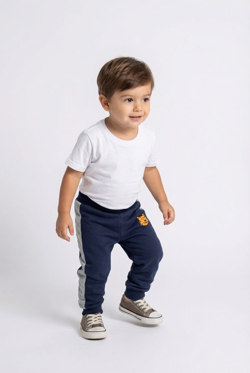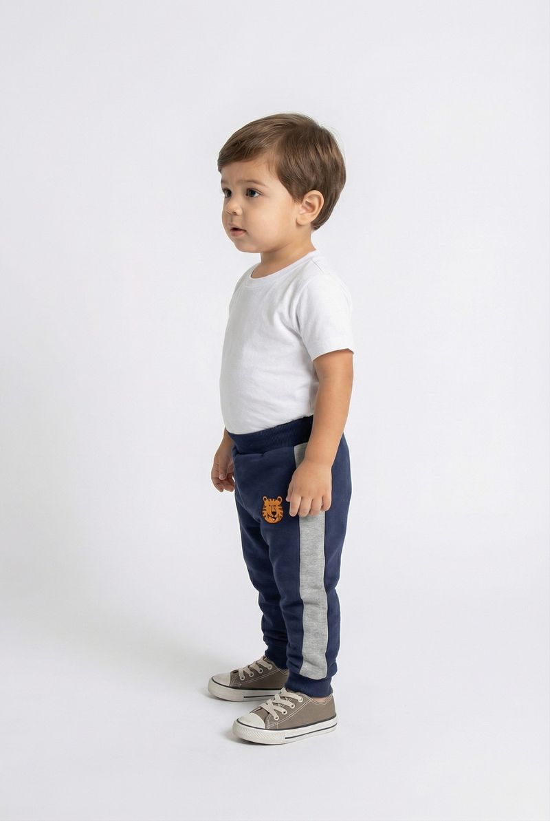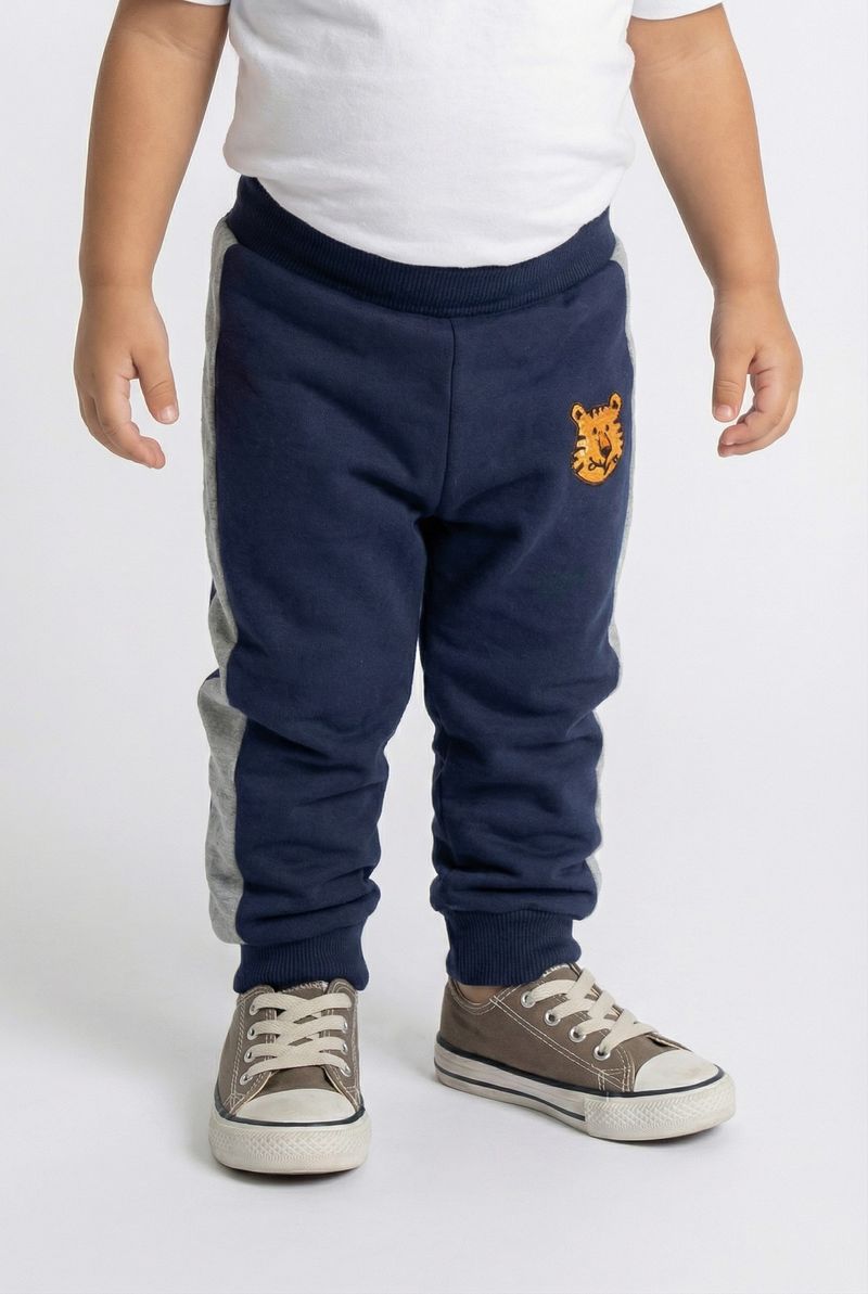 A Calça Moletom Infantil Caedu oferece conforto e estilo para os pequenos. Em azul marinho vibrante, possui aplique de tigre e faixa lateral cinza, além de cós e punhos ajustados. Feita em moletom com felpa 100% poliéster, é a roupa infantil ideal para o dia a dia.