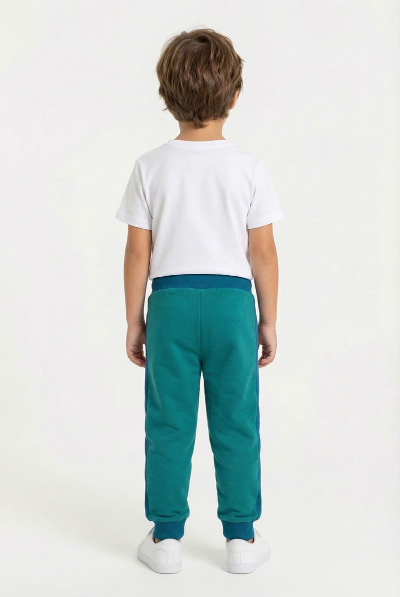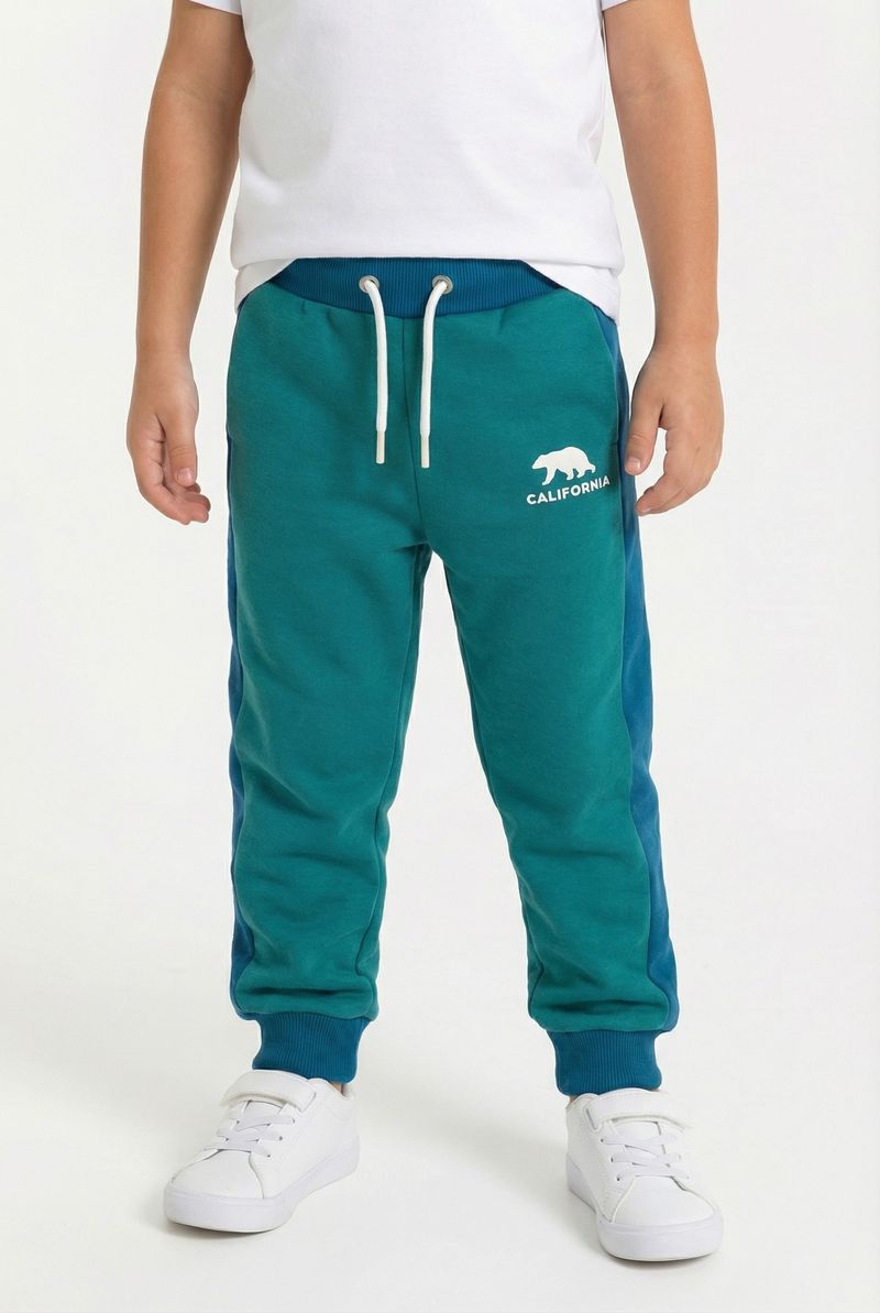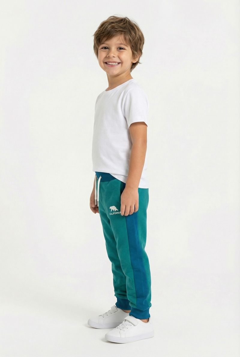 A Calça de Moletom Infantil California Caedu garante conforto e estilo. Em moletom com felpa 100% poliéster, seu vibrante verde turquesa com recortes laterais azuis e estampa 'CALIFORNIA' é ideal para os pequenos brincarem com liberdade e charme.