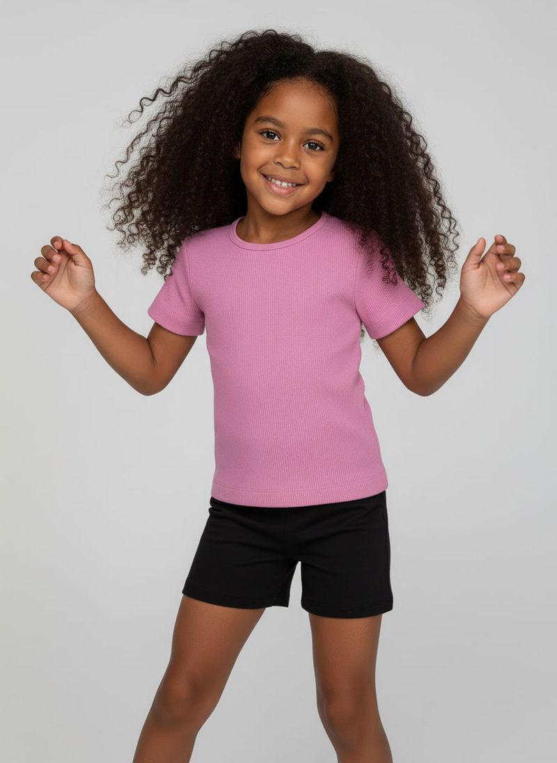 Combine a Blusa Infantil Rosa Médio Canelada Macia com um short preto para um visual casual e divertido, ou com saias estampadas para um toque mais charmoso. Complete o look com tênis confortáveis ou sapatilhas e adicione uma jaqueta leve em dias mais frescos para um estilo completo e versátil.