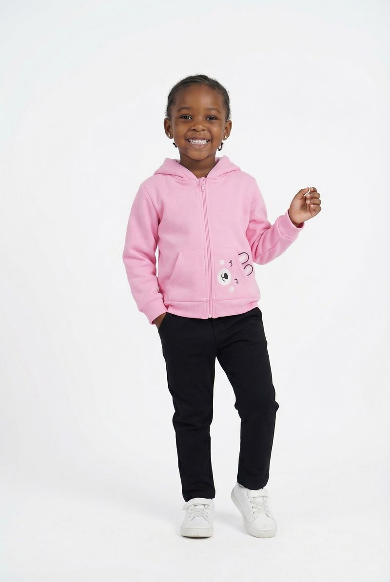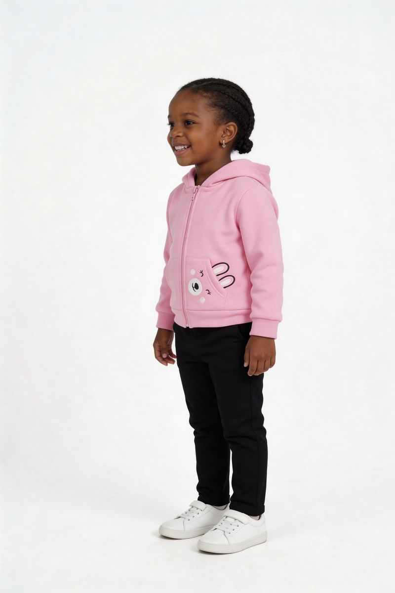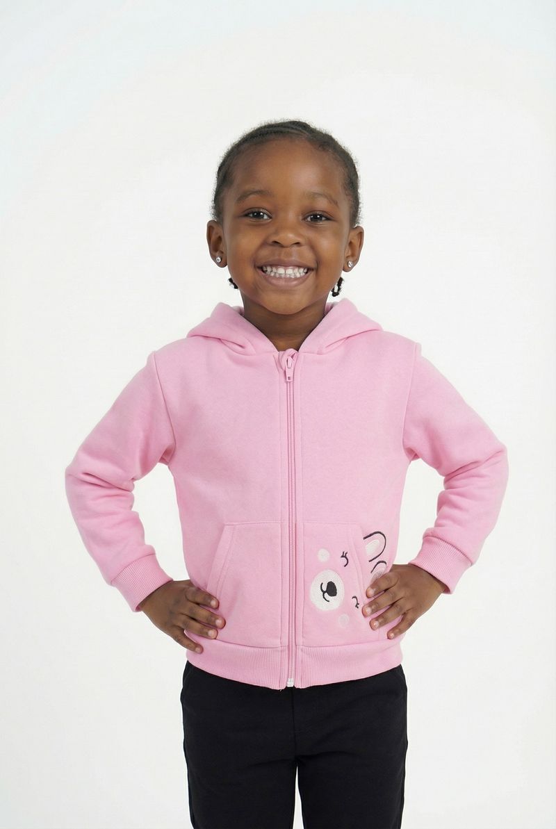 O Moletom Infantil Rosa Caedu oferece conforto e estilo para os pequenos. Com zíper frontal, capuz e um adorável ursinho no bolso, esta peça em moletom com felpa é perfeita para o dia a dia, proporcionando aconchego e um visual encantador. Ideal para a moda infantil.