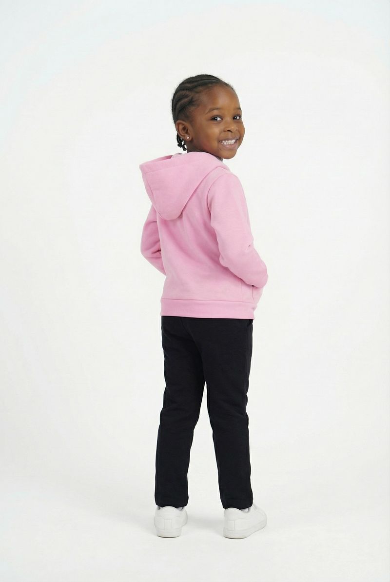 Combine este moletom infantil rosa com uma calça preta ou jeans para um look casual e despojado. Para os pés, tênis brancos ou coloridos complementam o visual com conforto. Adicione um gorro ou um cachecol leve em dias mais frescos para um toque extra de estilo e aconchego, criando um conjunto charmoso e prático.