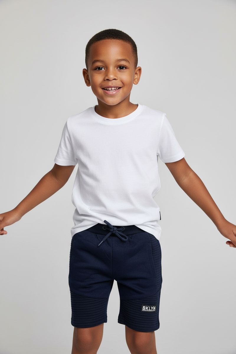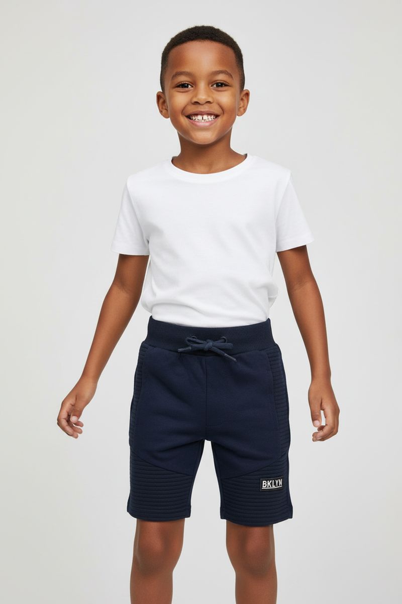 A Bermuda Infantil de Moletom Caedu BKLYN oferece conforto e estilo para o dia a dia. Com design azul-marinho e detalhes acolchoados, possui cós ajustável e aplique "BKLYN", garantindo um visual moderno e liberdade para brincar. Perfeita para a moda infantil.