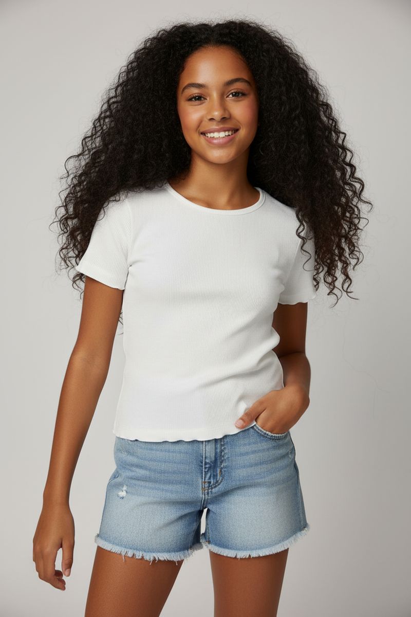 A Blusa Branca Canelada Manga Curta com Barra Babado Caedu é perfeita para as meninas que amam estilo e conforto. Feita em malha canelada de poliéster e elastano, oferece toque suave e liberdade de movimento. Seu design com barra babado adiciona um charme único, ideal para looks cheios de personalidade.