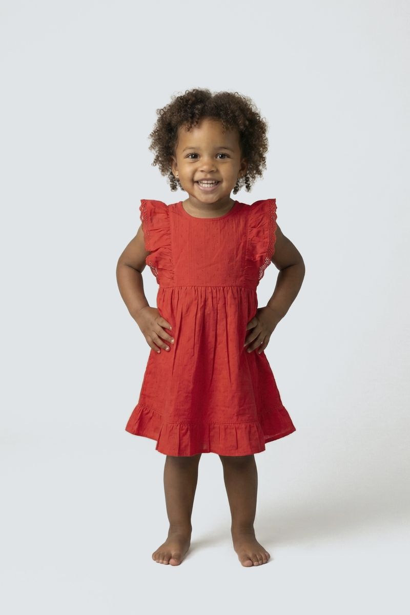 Vestido Infantil Vermelho Dobby com Babados Delicados Caedu: Conforto e estilo para sua pequena!