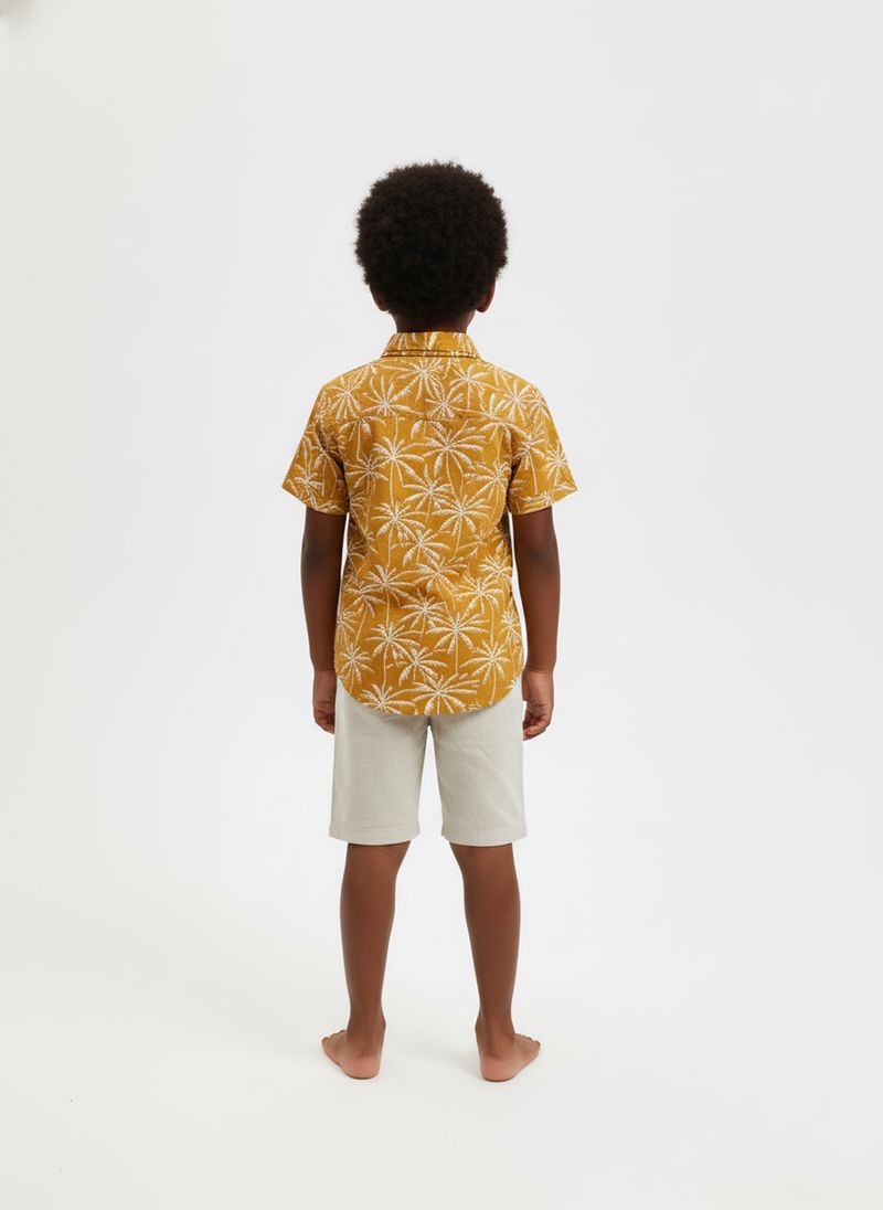 A Camisa Infantil Caedu em viscose oferece conforto e estilo para os pequenos. Com estampa de coqueiros em amarelo mostarda, esta roupa infantil de manga curta e gola clássica é perfeita para um visual despojado e cheio de personalidade. Ideal para a moda infantil.