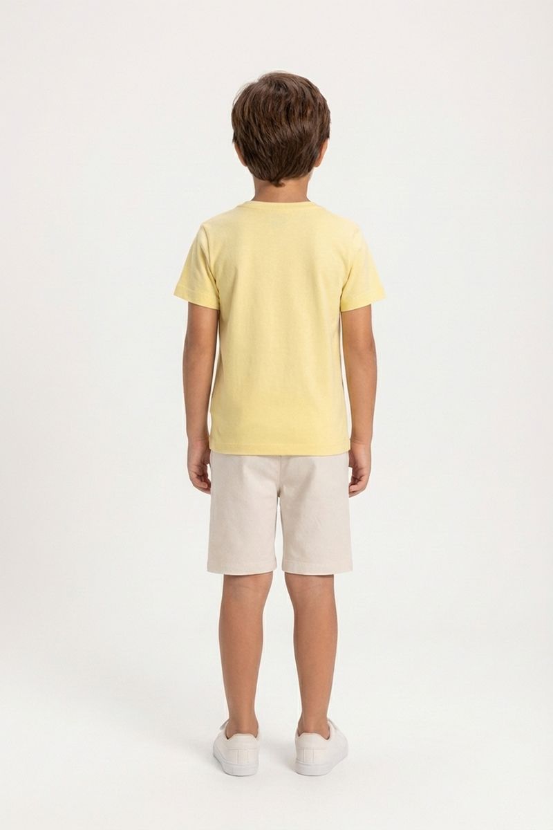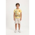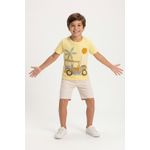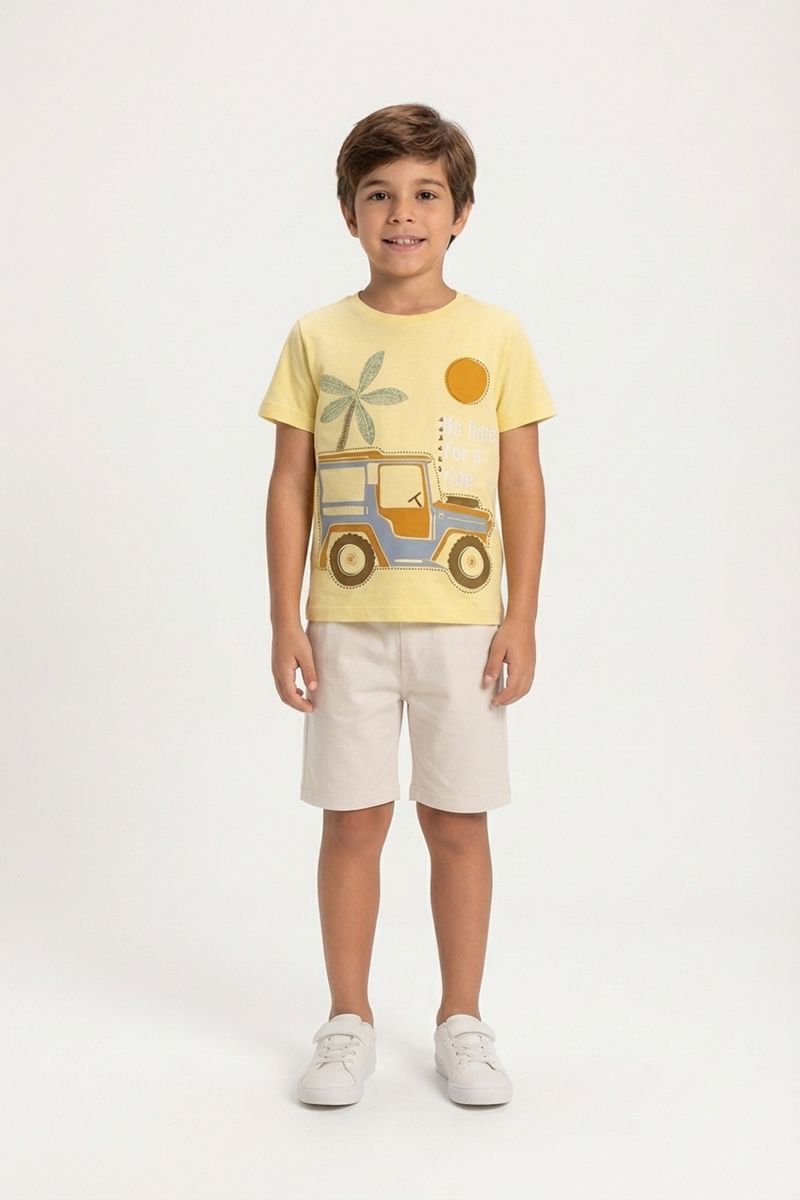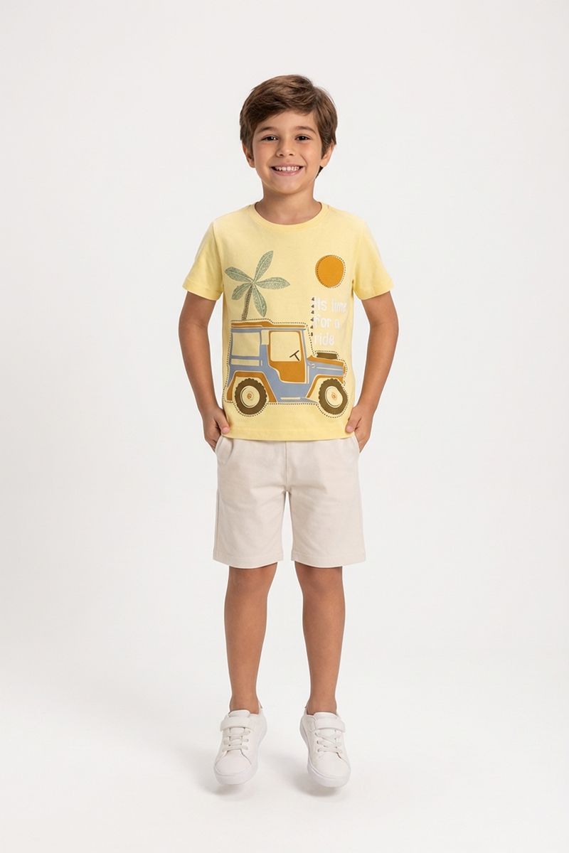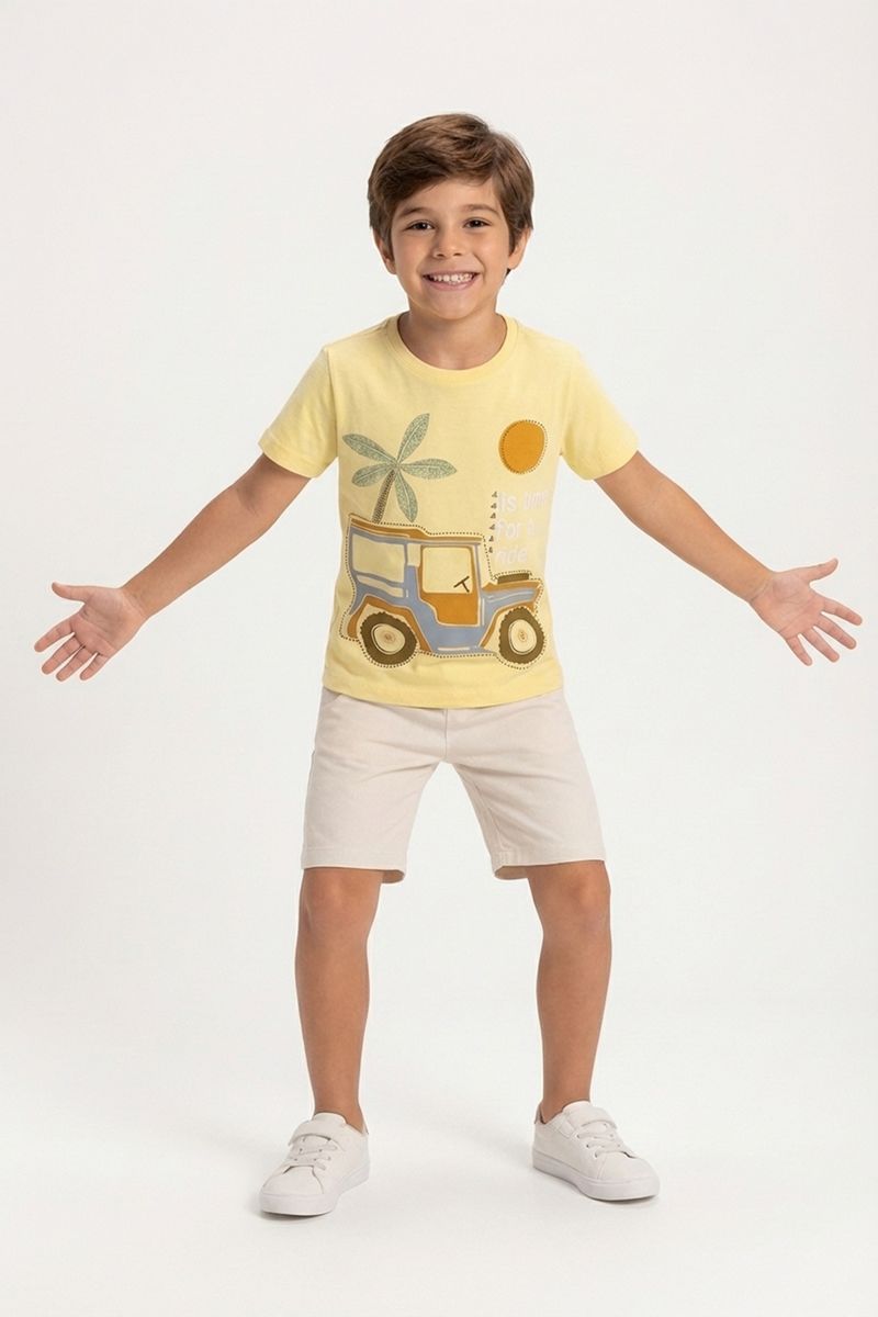 Prepare seu pequeno aventureiro para o dia com o Conjunto Infantil Carro de Aventura Caedu. Confeccionado em 100% algodão e meia malha, oferece conforto e liberdade. A blusa amarela com estampa vibrante de jipe e o shorts bege liso criam um visual casual e cheio de estilo.