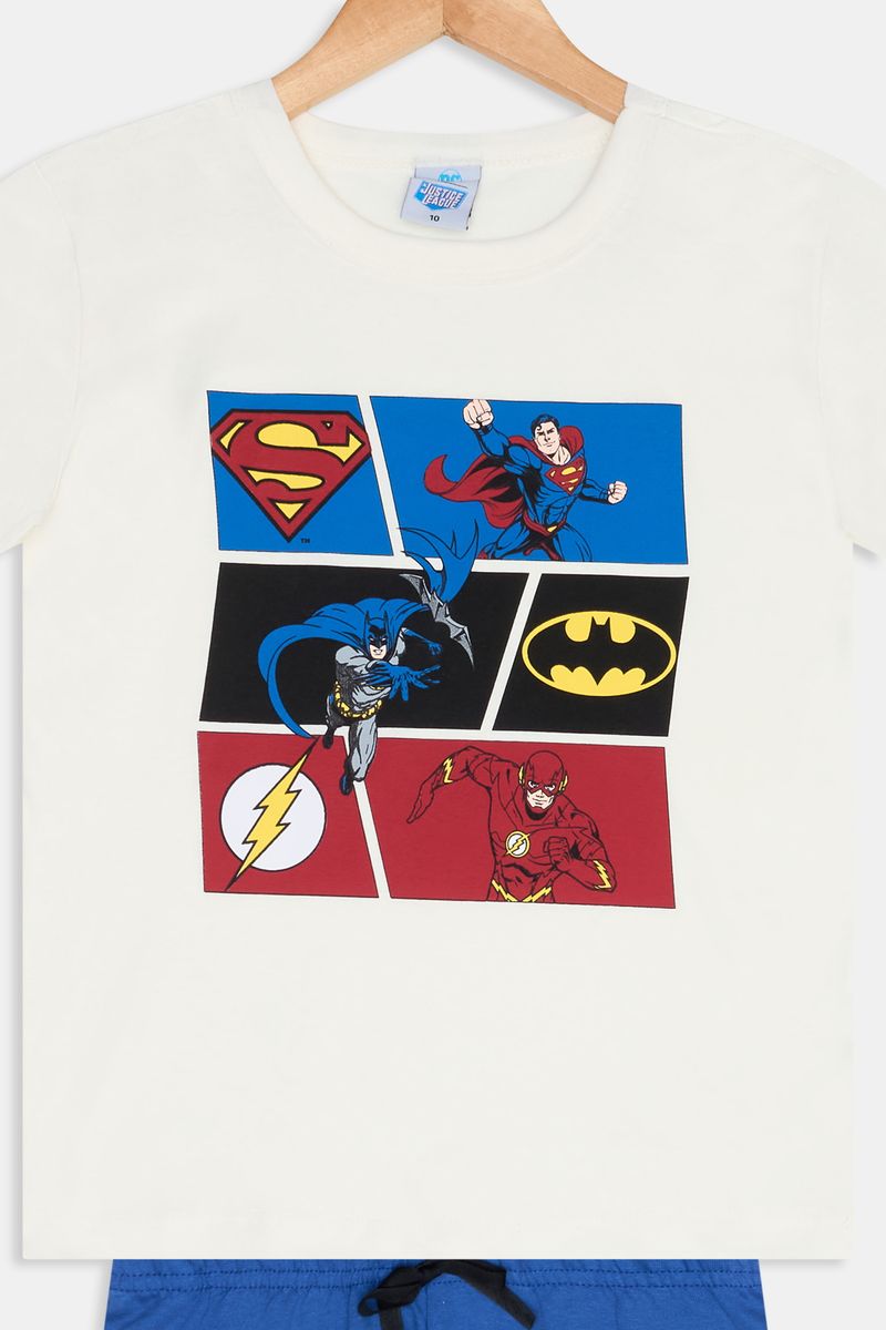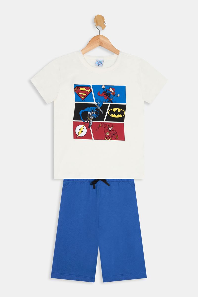 O Conjunto Infantil Caedu Liga da Justiça, em 100% algodão, oferece conforto e estilo. Com camiseta off-white estampada shorts azul, é a roupa infantil ideal para dia a dia.