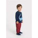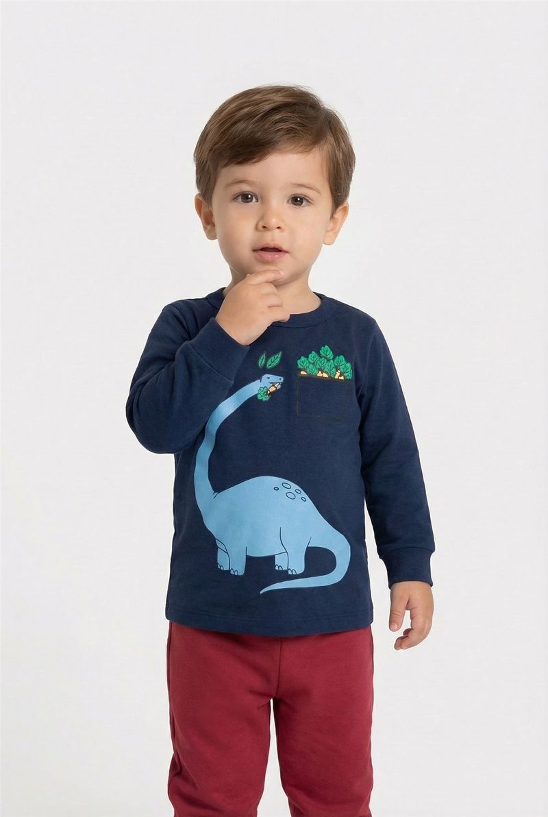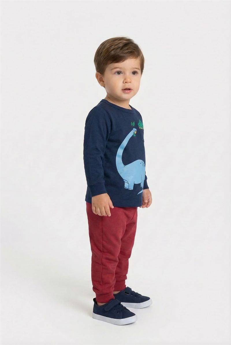 O Conjunto Infantil Dinossauro Aventureiro Caedu, confeccionado em moletom com felpa, proporciona conforto e estilo com sua blusa azul marinho de dinossauro e calça vermelha, ideal para os pequenos exploradores.