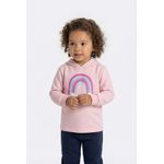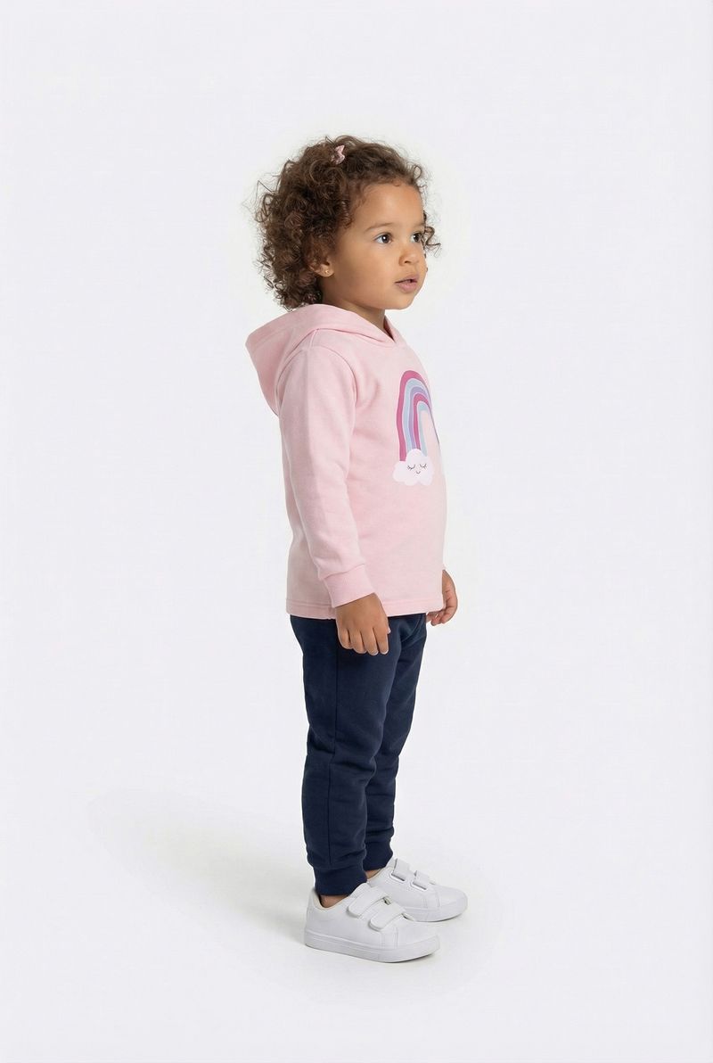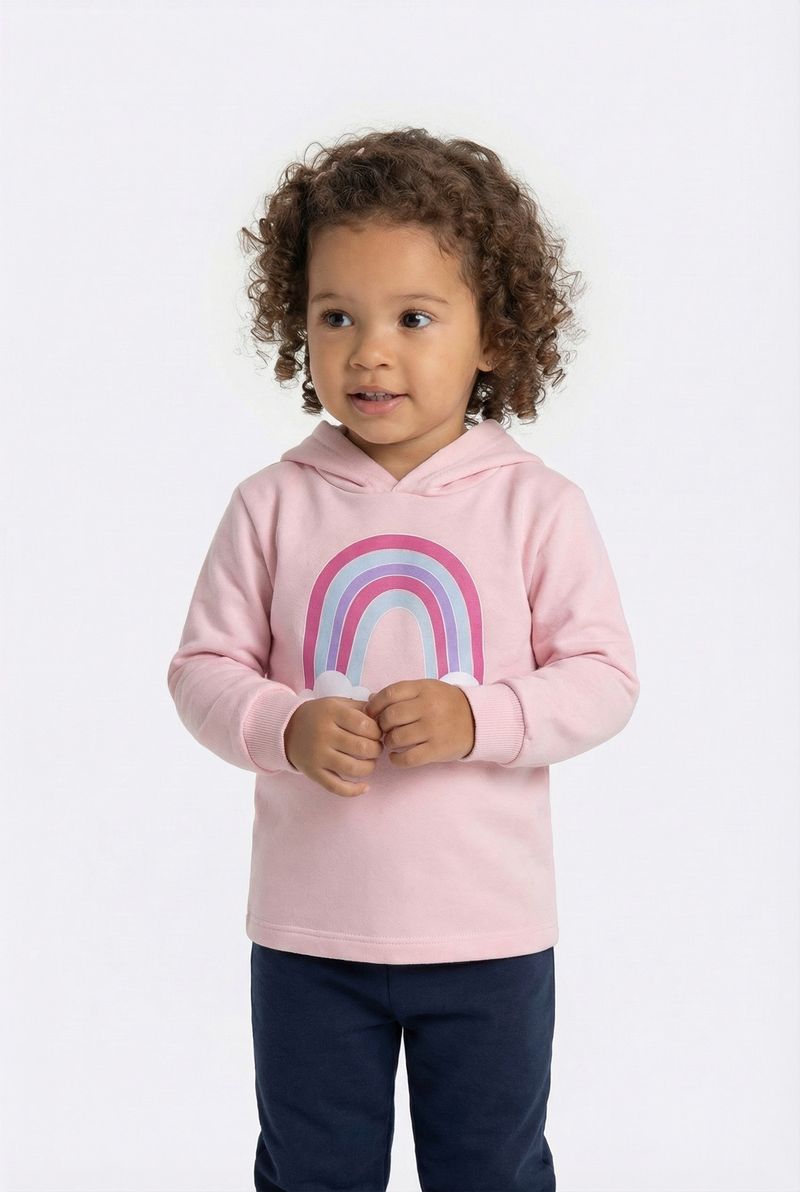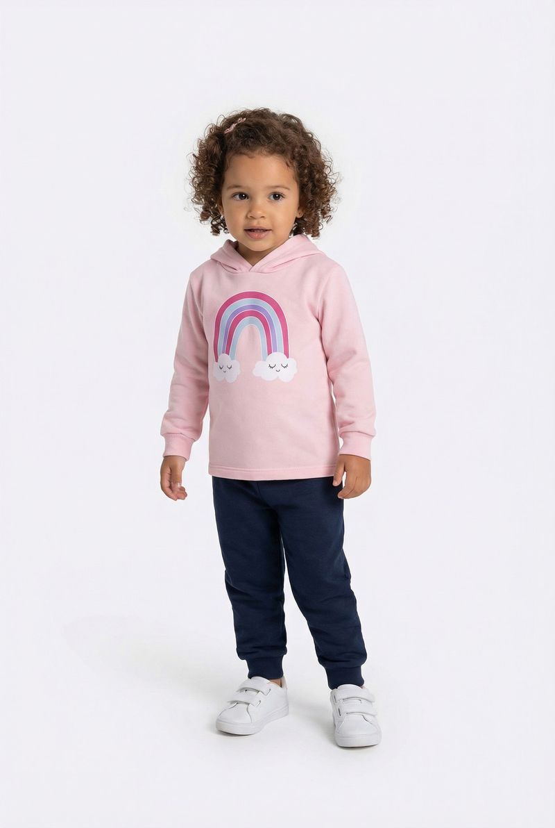 O Moletom Infantil Rosa Claro com Capuz Caedu, da nova coleção, é ideal para sua pequena. Confeccionado em moletom com felpa, oferece conforto e maciez. A estampa de arco-íris e nuvens sorridentes traz um toque lúdico e vibrante, perfeito para o dia a dia. Esta roupa infantil garante estilo e aconchego.