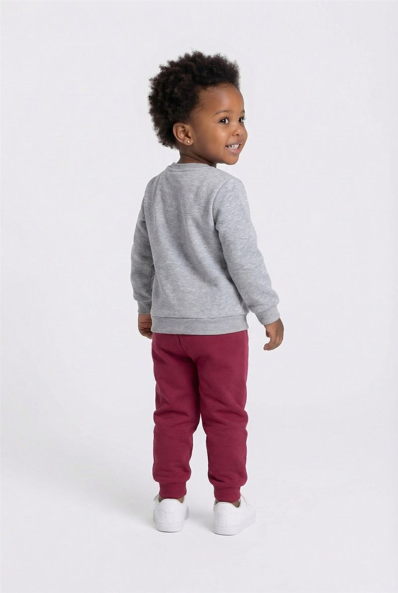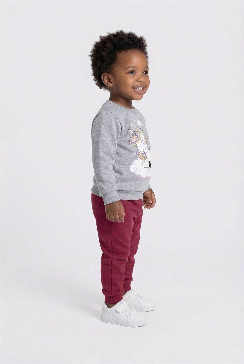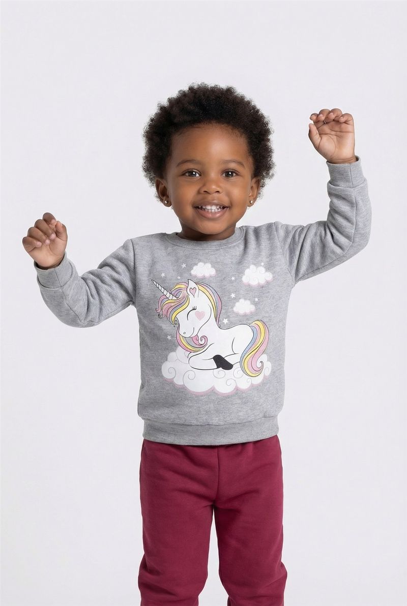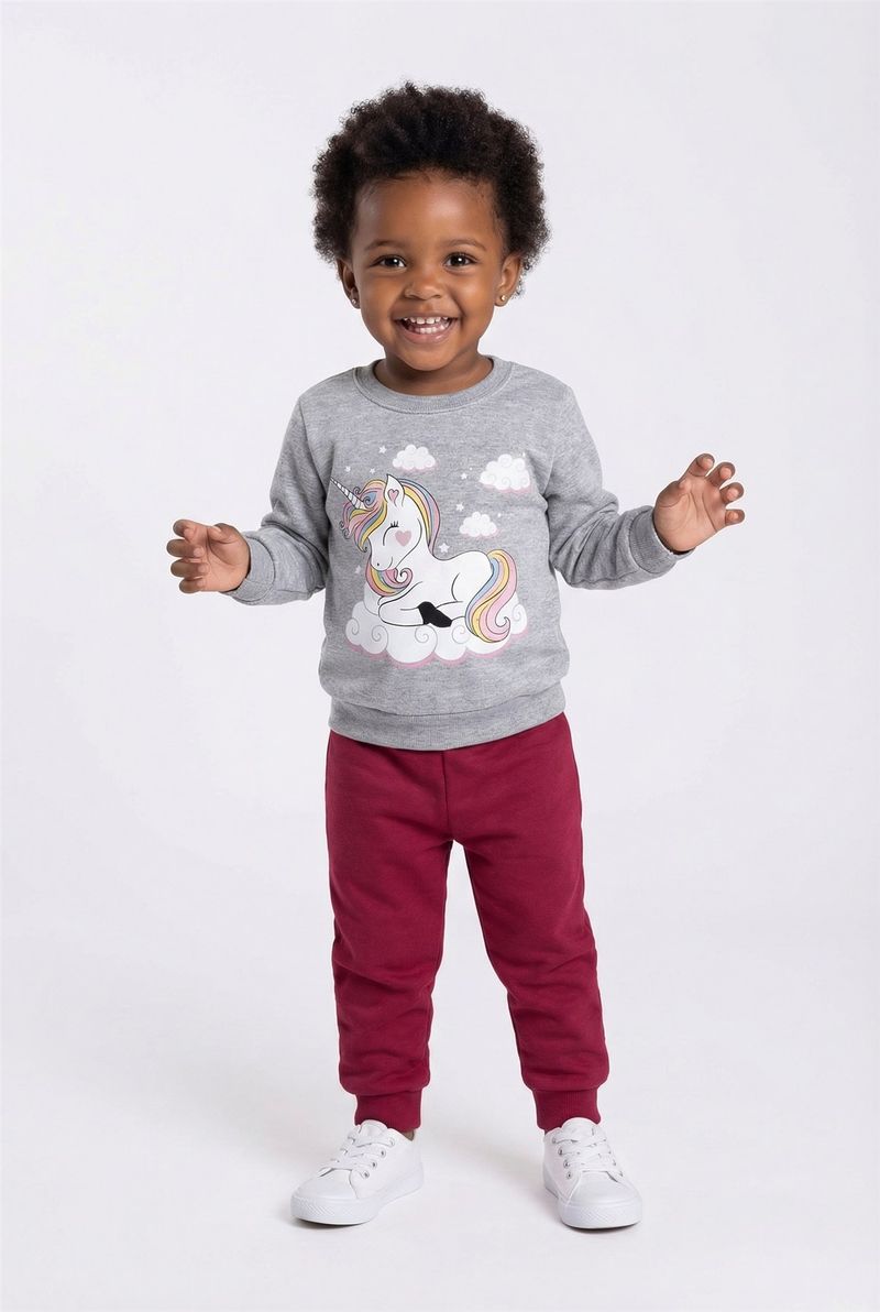 Prepare sua pequena para um mundo de sonhos com o Conjunto Infantil Caedu Moletom Unicórnio Sonhador. Confeccionado em moletom sem felpa, oferece conforto e liberdade. A blusa cinza mescla com estampa de unicórnio e a calça bordô com punhos garantem um visual encantador e durável para as aventuras diárias.