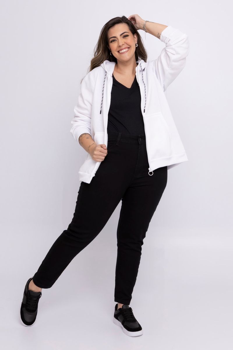 Jaqueta feminina confeccionada em moletom, modelo plus size. A peça possui capuz, bolsos, manga longa e fechamento em zíper. Item básico e confortável, ideal para compor seus looks nos dias mais frios.