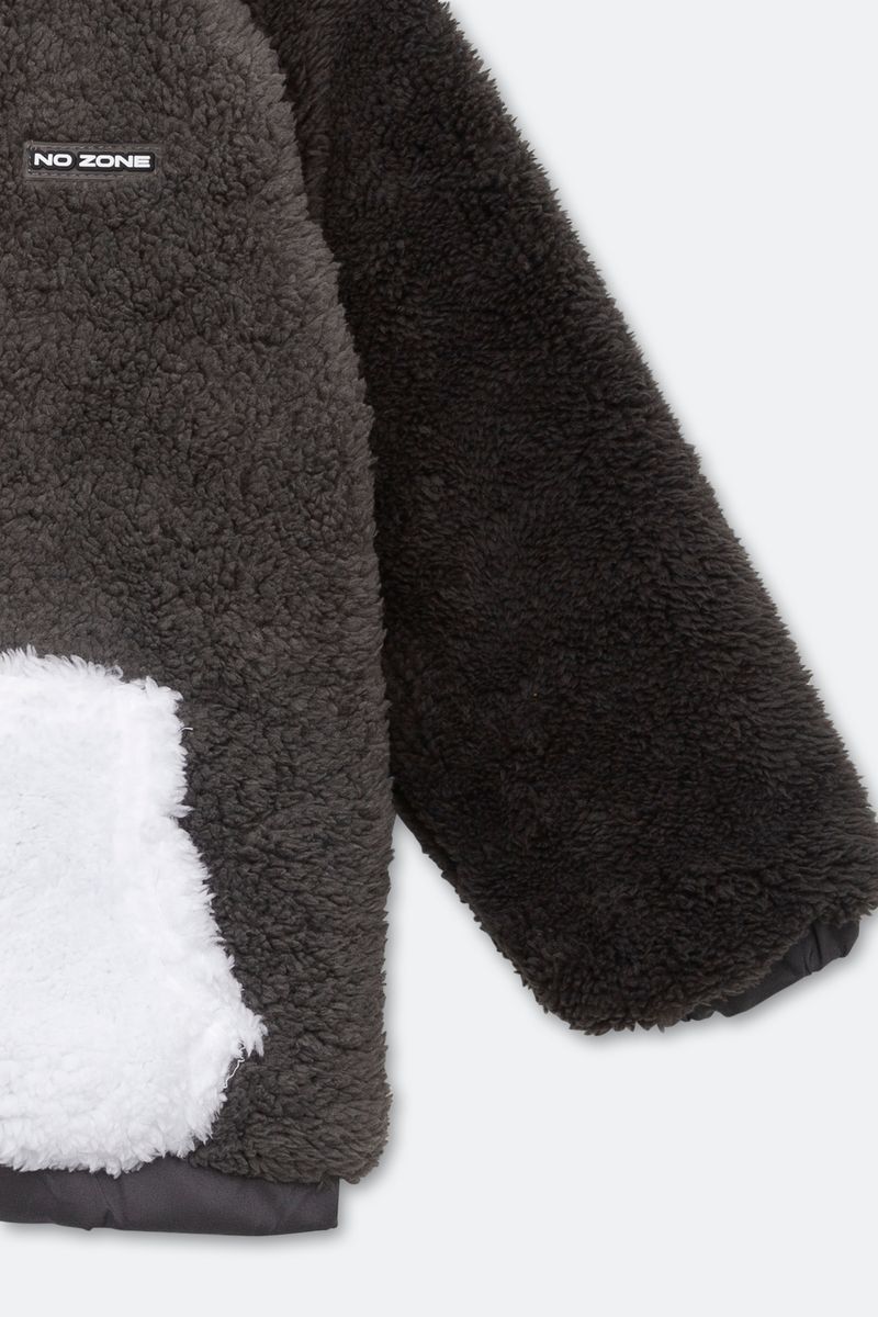 Jaqueta infantil em sherpa cinza escuro, com capuz e fechamento por zíper. Ideal para manter os pequenos aquecidos com muito conforto e estilo.
