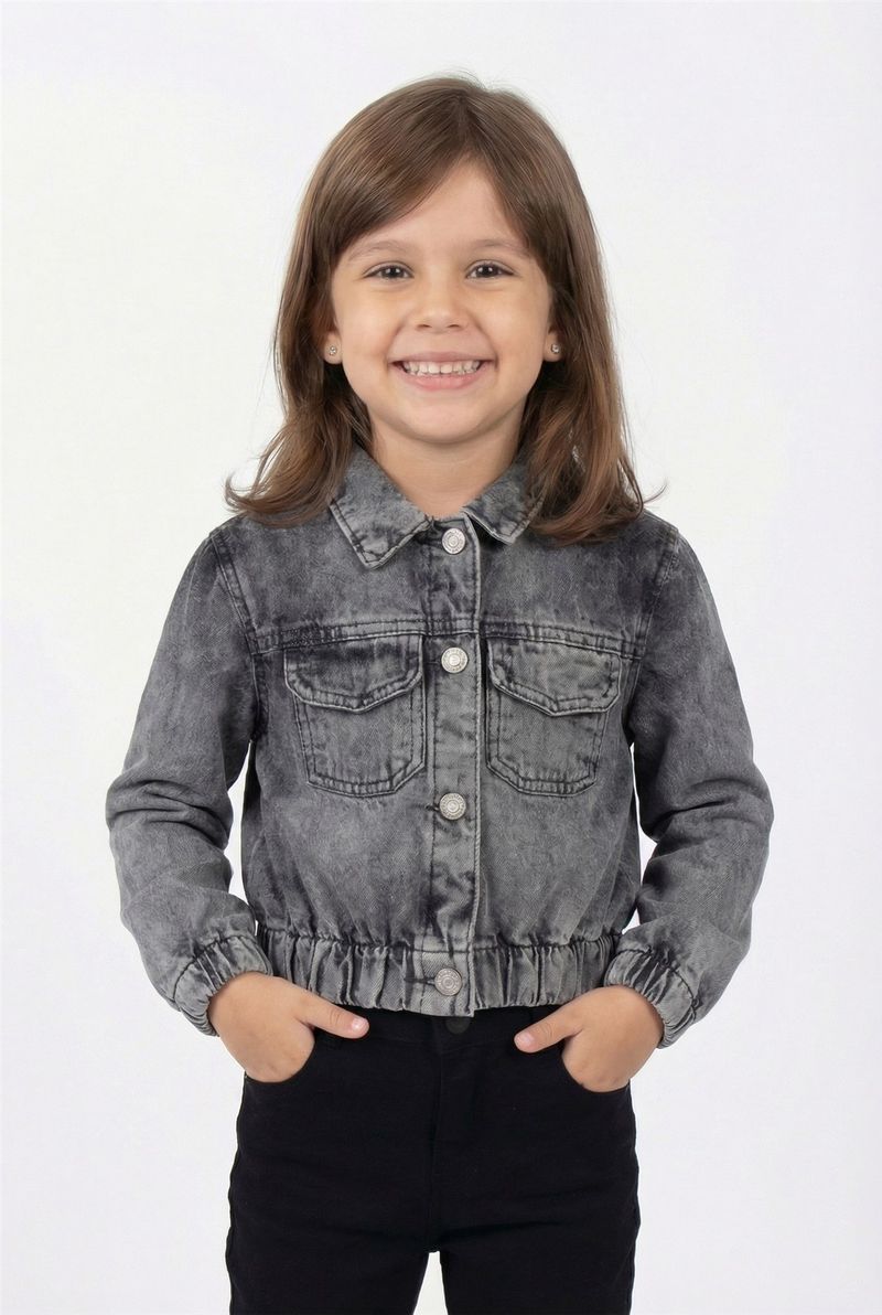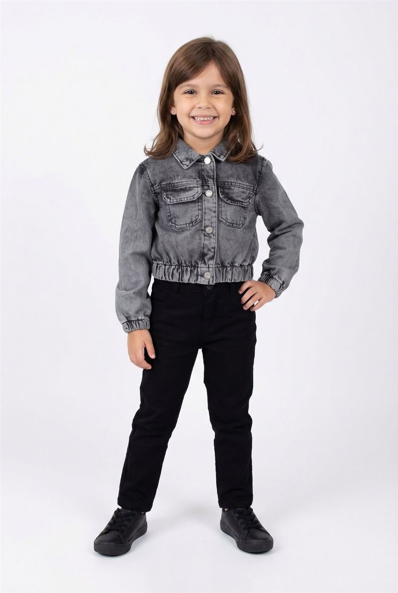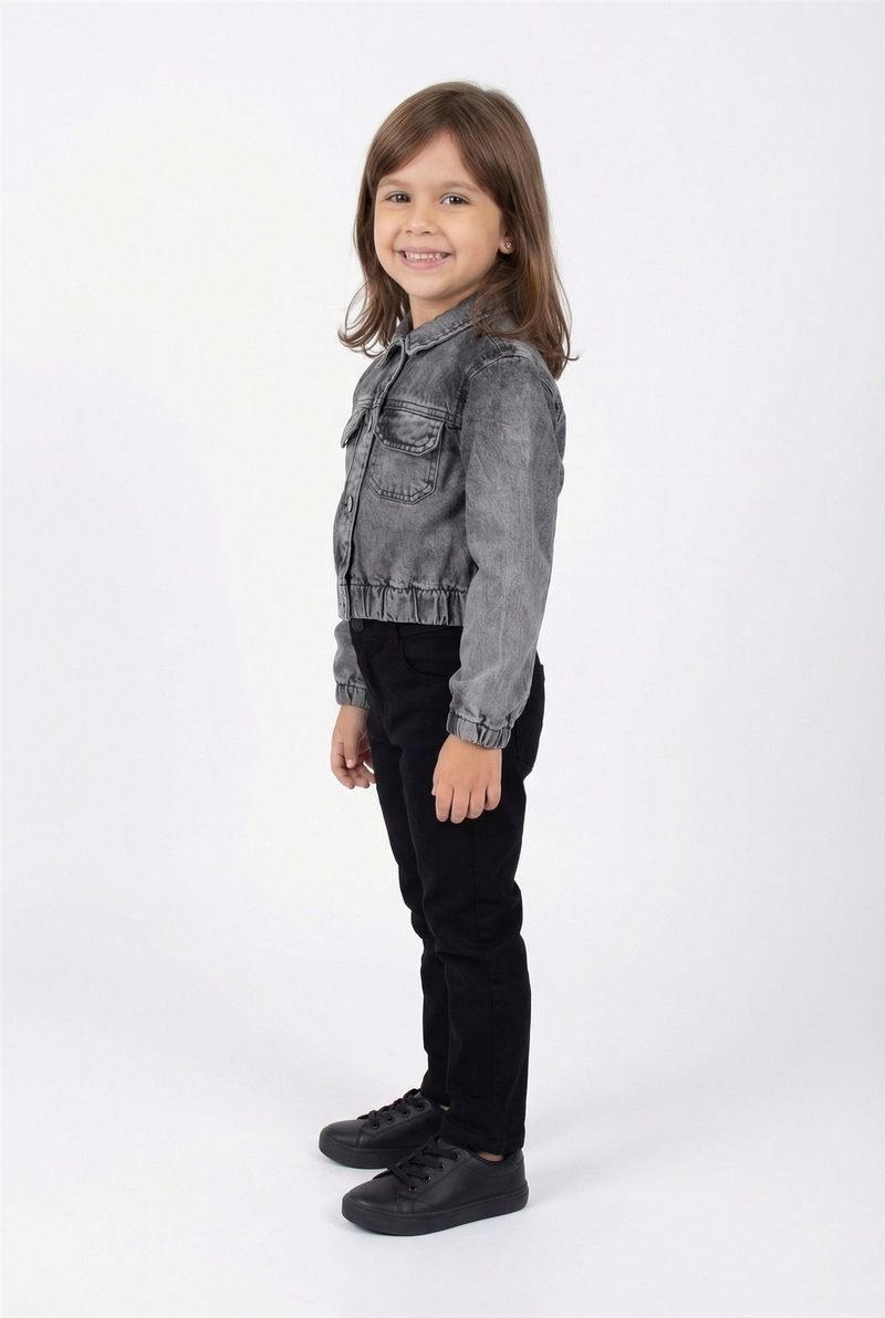 A Jaqueta Jeans Infantil Cropped Preto Estonado Caedu oferece estilo e conforto. Em denim de alta qualidade, seu design cropped com lavagem estonada e botões metálicos garante um toque fashion para as pequenas.