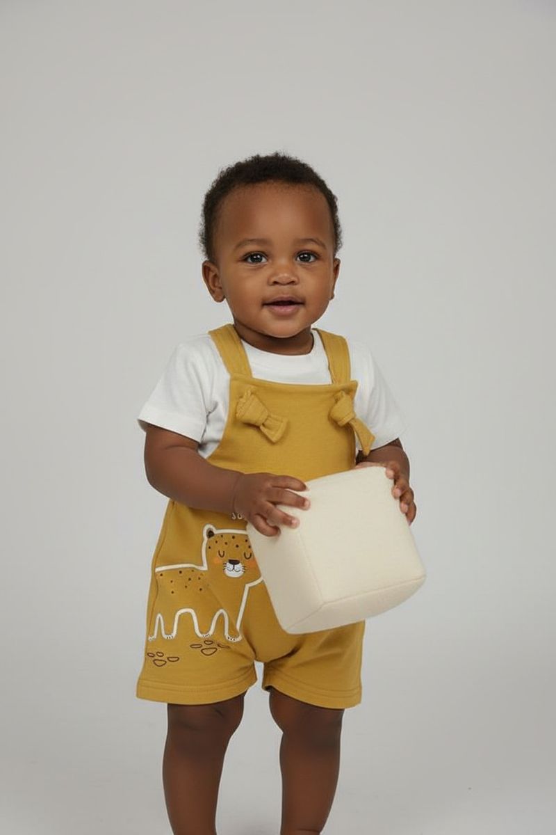 Combine esta jardineira com uma blusa básica de manga curta ou longa em tons neutros, como branco ou creme, para um visual completo. Para os pés, tênis de bebê ou sandálias confortáveis são ótimas opções. Adicione um boné ou chapéu para proteger do sol e completar o look com ainda mais charme e estilo.
