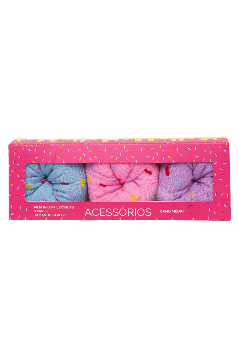 Kit composto por 3 pares de meias. As peças têm cano médio, estampas e acabamento em ribana.